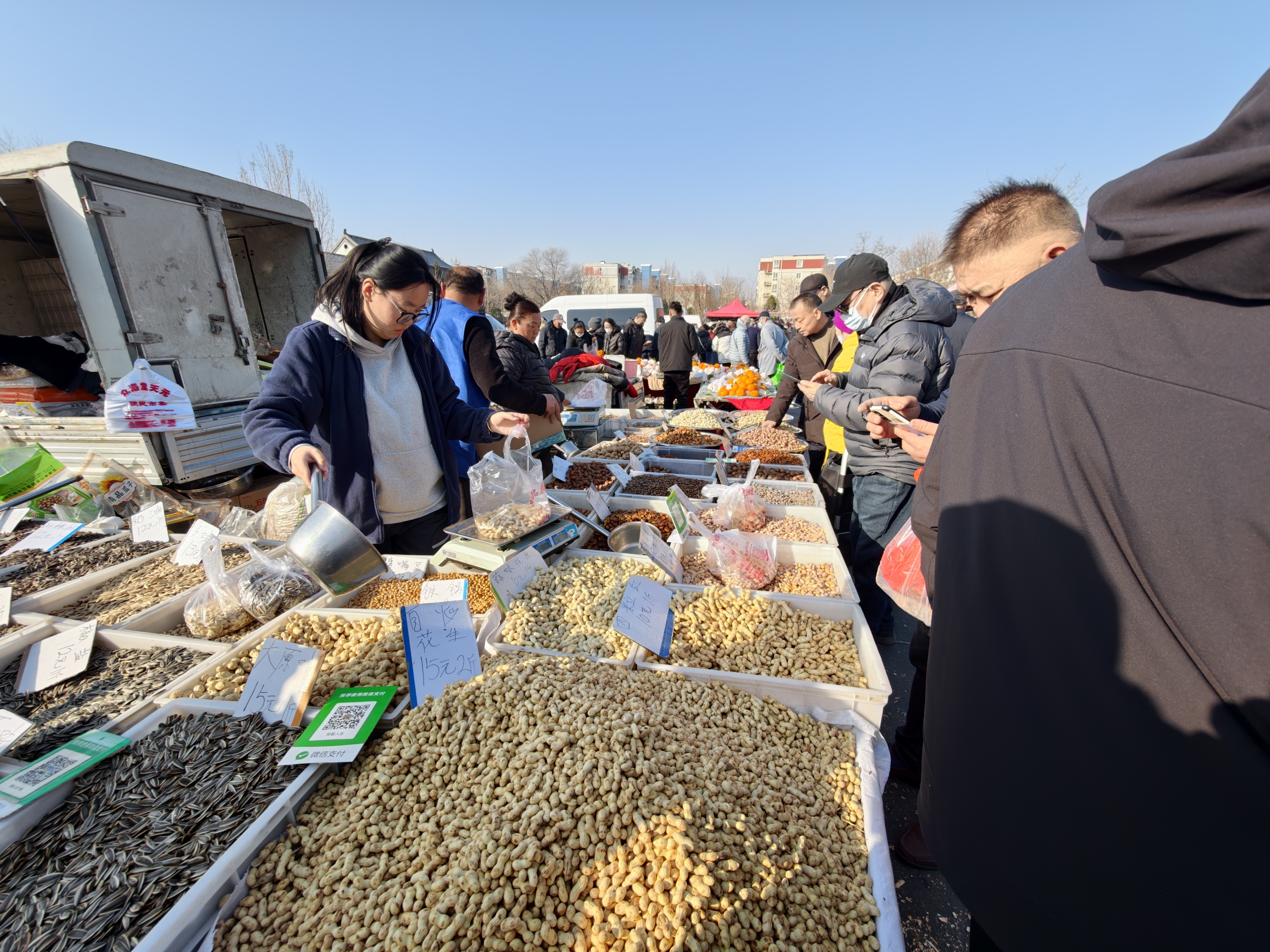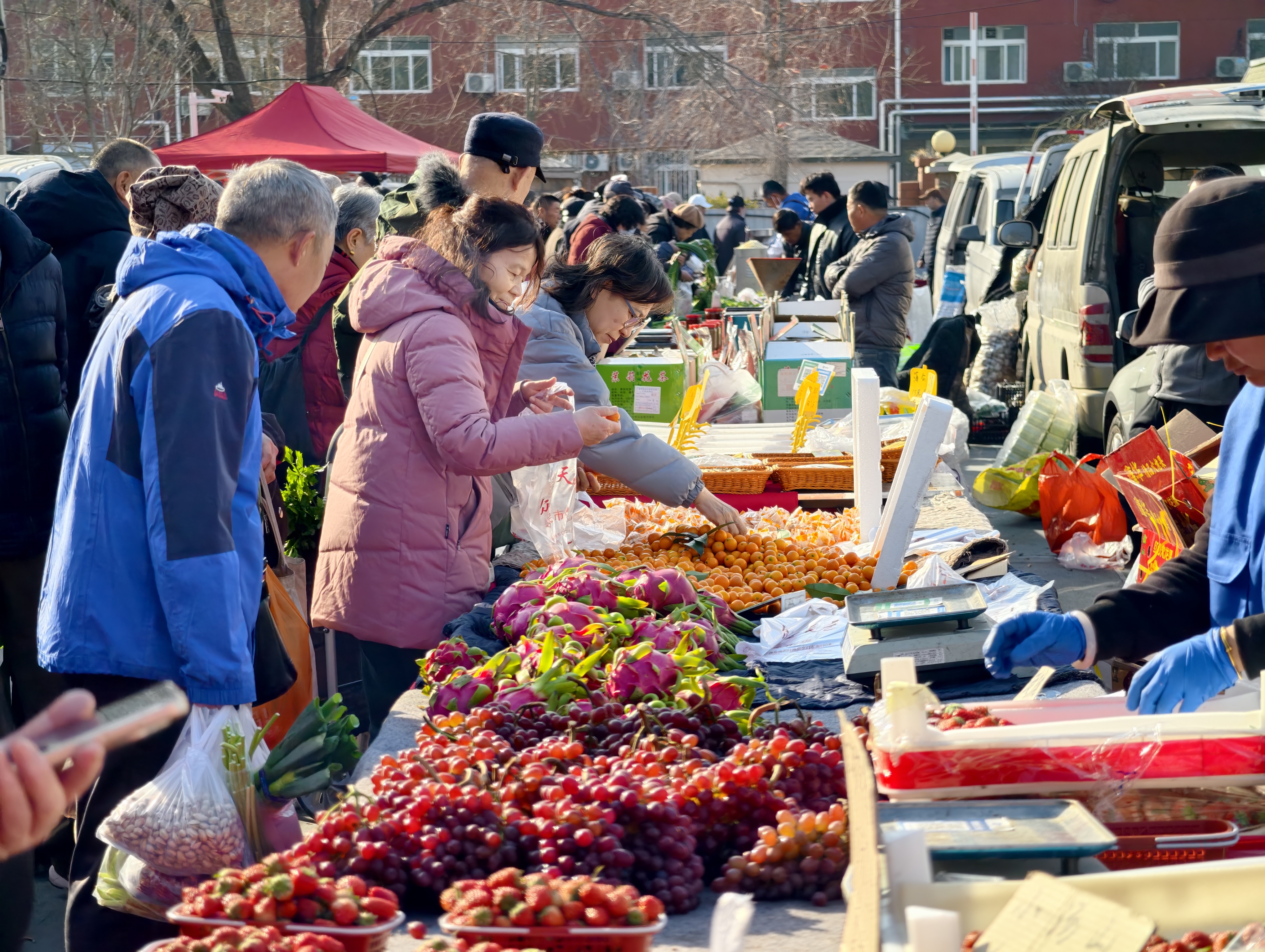 她的购物车里,既有丰台本地的特菜,也有河北的驴肉火烧、天津的煎饼果子——一场大集,把京津冀的年味儿都串门串到了一起。