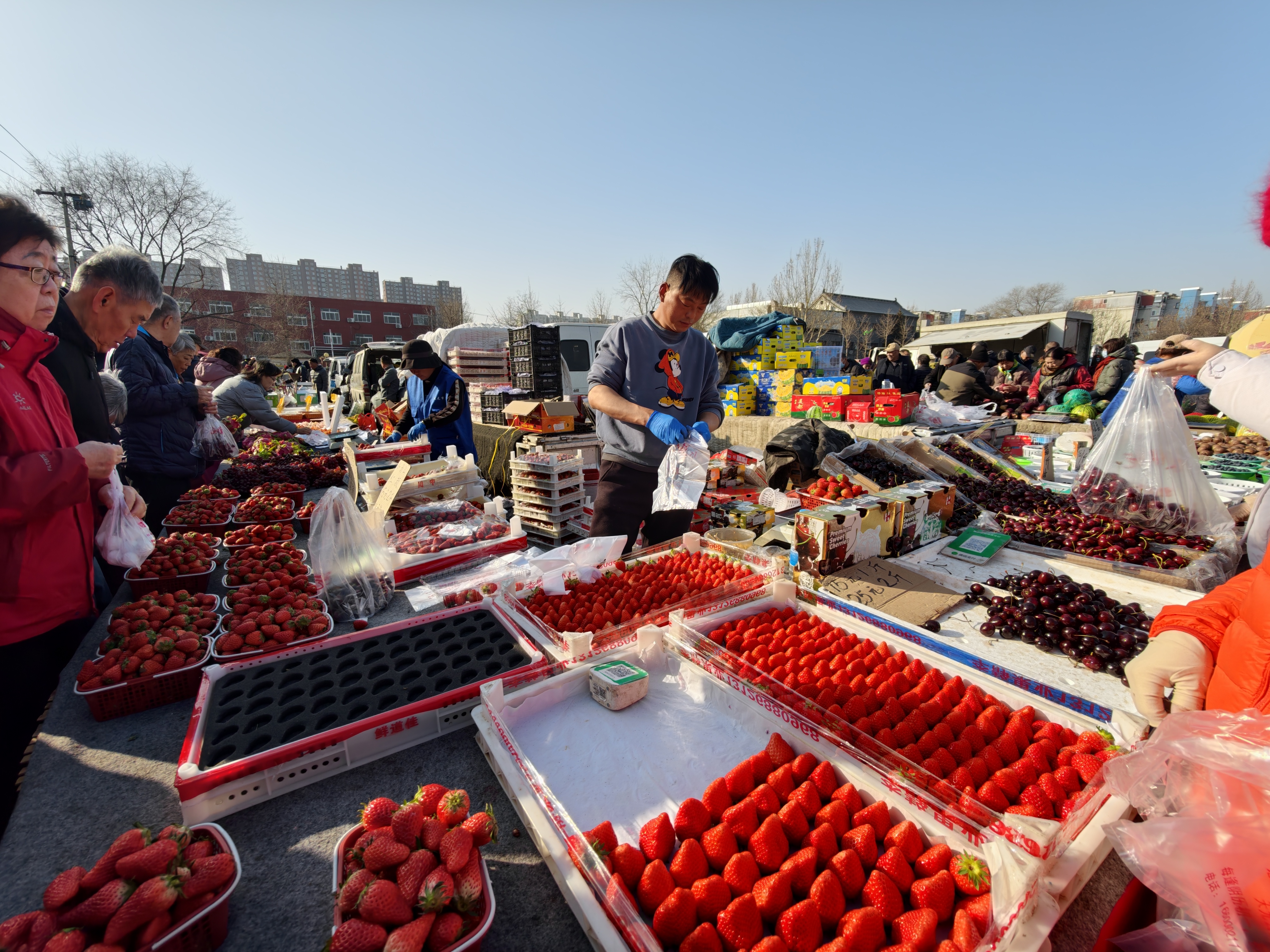 再往里挤几步,草莓的甜香硬是从人缝里钻出来。丹东红颜草莓装在巴掌大的泡沫盒里,红得发亮,绿蒂还支棱着。一个小伙子蹲在摊前,尝了一颗,腮帮子一鼓,汁水差点滋出来:“姐,这太甜了,给我来五盒,走亲戚用。”卖草莓的大姐麻利地摞盒子,嘴上不饶人:“五盒够谁吃?你自个儿坐那儿一会儿就能旋一盒。” 小伙子挠挠头,又加了两盒。