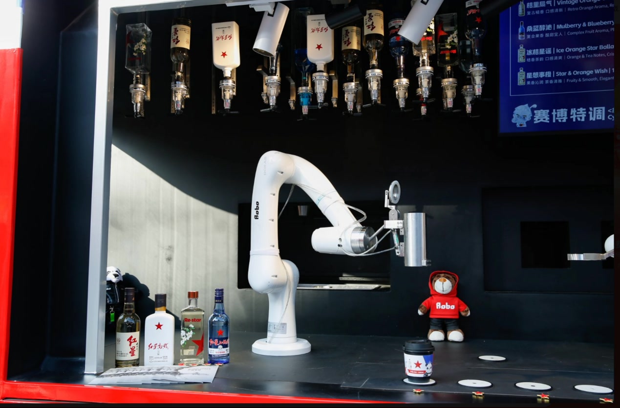 本次隆福寺庙会令人眼前一亮的,是红星联合乐博空间创新打造的AI智能机器人调酒车——“红星精灵”胶囊酒馆。这一创新场景打破了传统老字号与年轻消费者的沟通壁垒,将国家级非遗酿造技艺与前沿AI科技深度融合,成为市集上的“流量担当”。