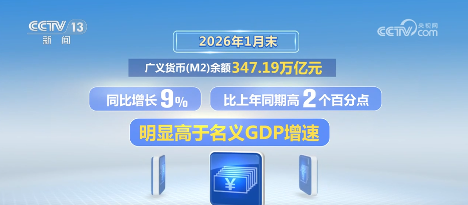 2026年1月末,广义货币(M2)余额347.19万亿元,同比增长9%,比上年同期高2个百分点,明显高于名义GDP增速;社会融资规模存量449.11万亿元,同比增长8.2%,比上年同期高0.2个百分点。广义货币(M2)和社会融资规模增速均保持在较高水平,持续为经济回升向好创造适宜的货币金融环境。中国民生银行首席经济学家温彬表示,广义货币(M2)和社会融资规模增速较快增长,充分体现了适度宽松的货币政策状态,有力支持了年初经济平稳开局。