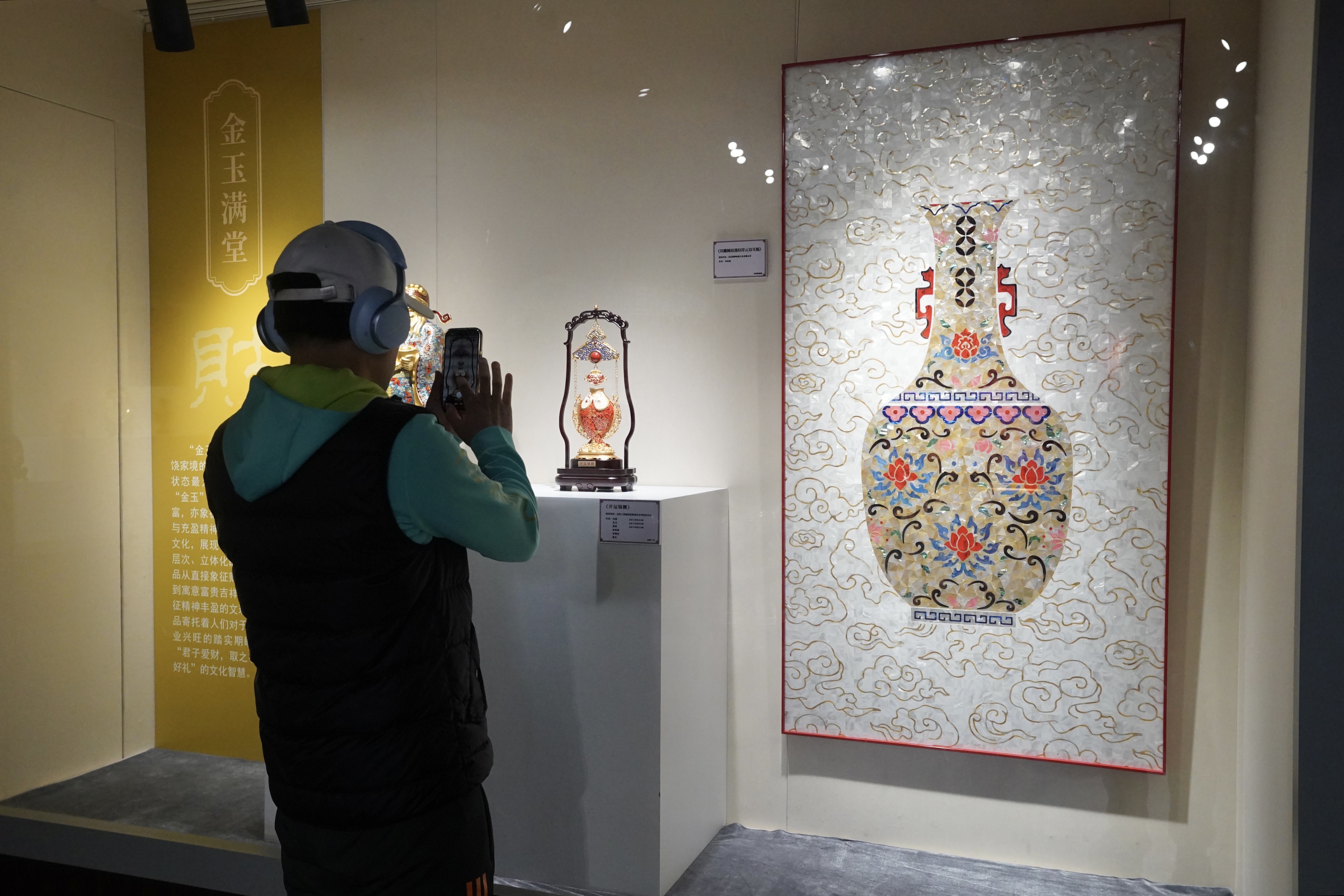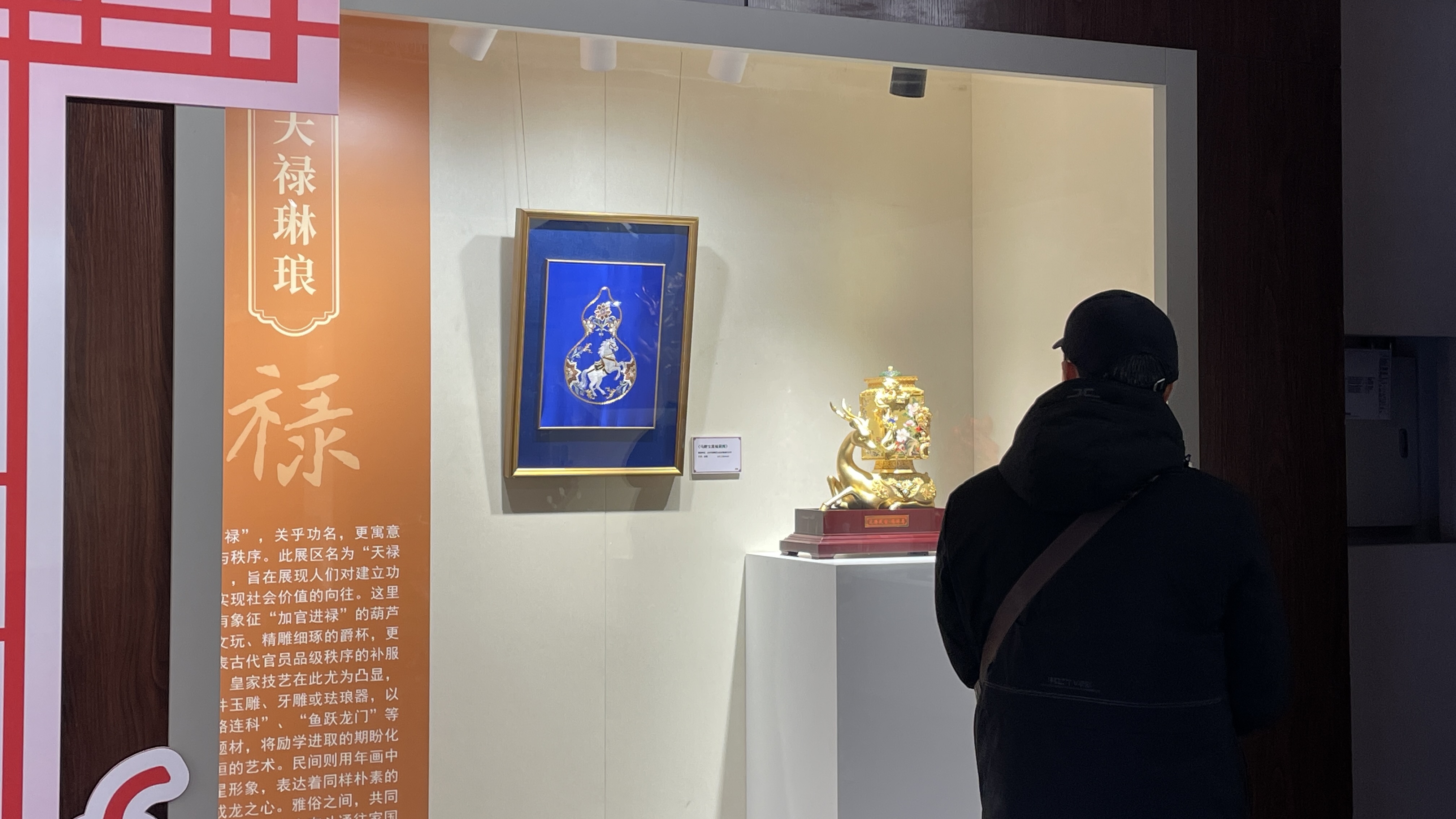 以“禄”为主题的东配殿内,天禄琳琅。展品多以瑞兽、祥禽、吉祥纹样为创作载体,线条考究、工艺精湛,既彰显传统匠艺之精妙,又寄托着人们对事业顺遂、加官进爵的美好祈愿,整体氛围庄重雅致,文化寓意深厚。