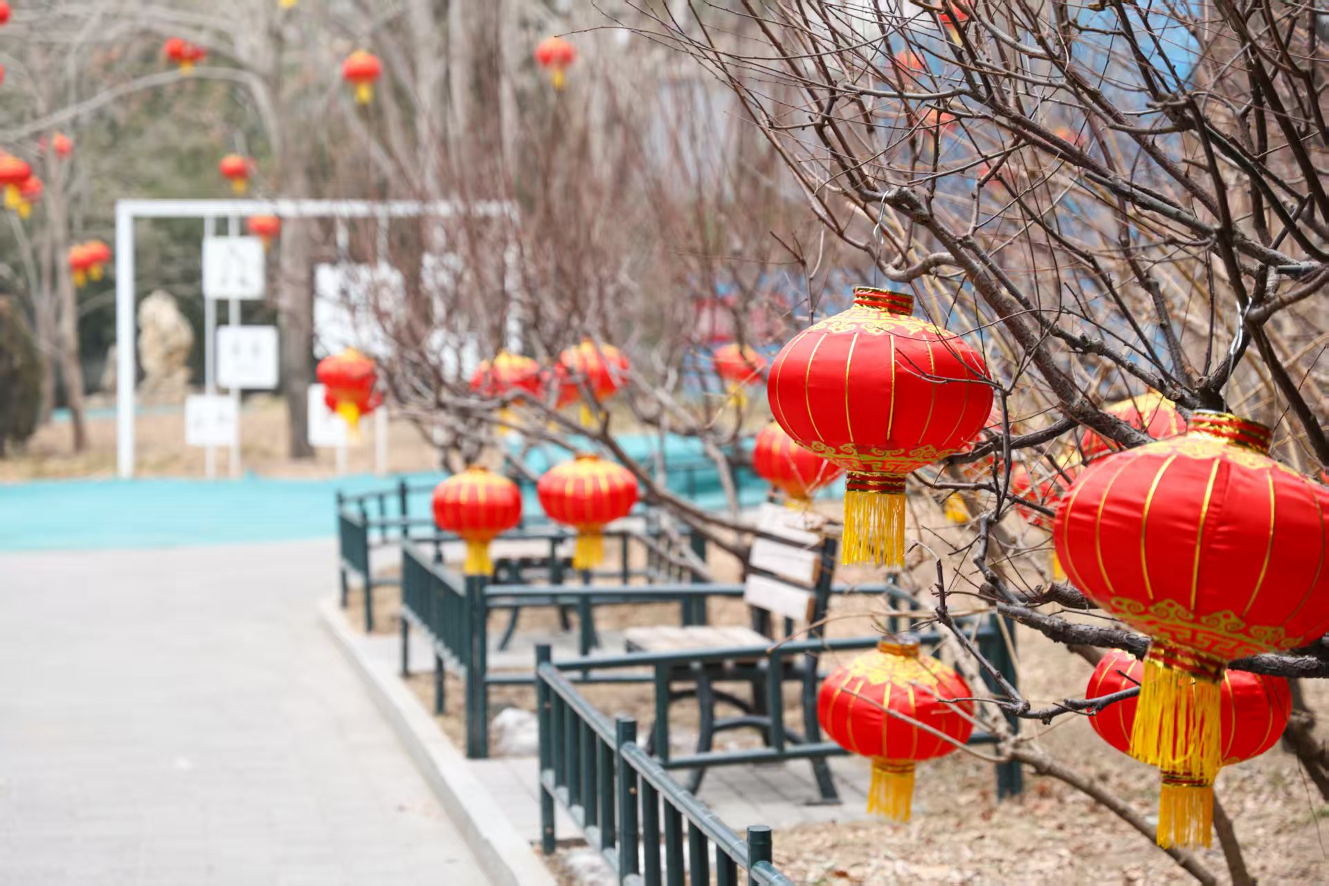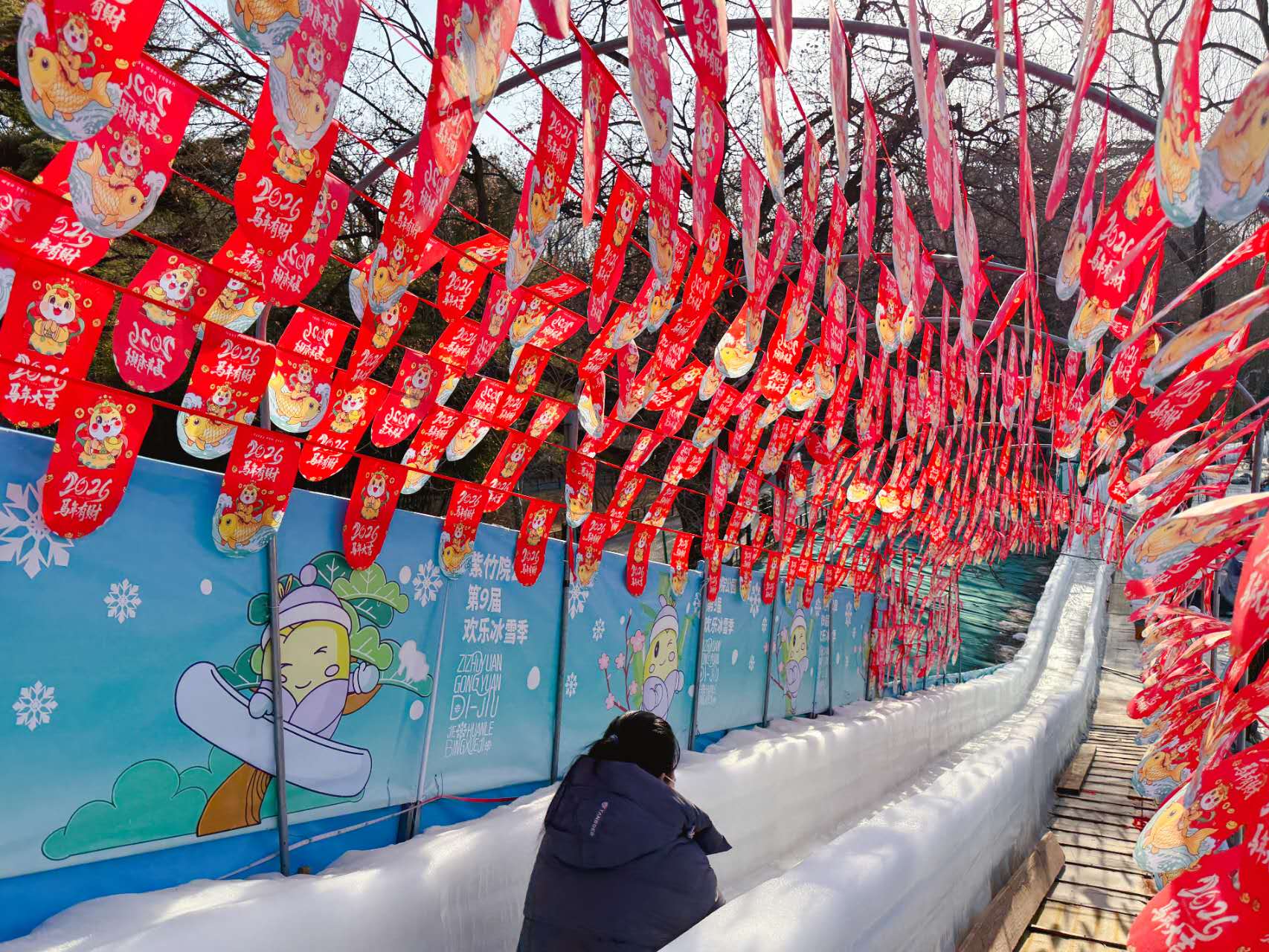 步入园内,1500余个大红灯笼、节日主题道旗以及桥梁硬质景观营造出热烈红火的节日氛围。冰雪活动场地利用中国结、红灯笼等传统装饰打造“冰暖相融”的独特冬日节庆景观,让市民游客处处感受到浓浓的年味。
