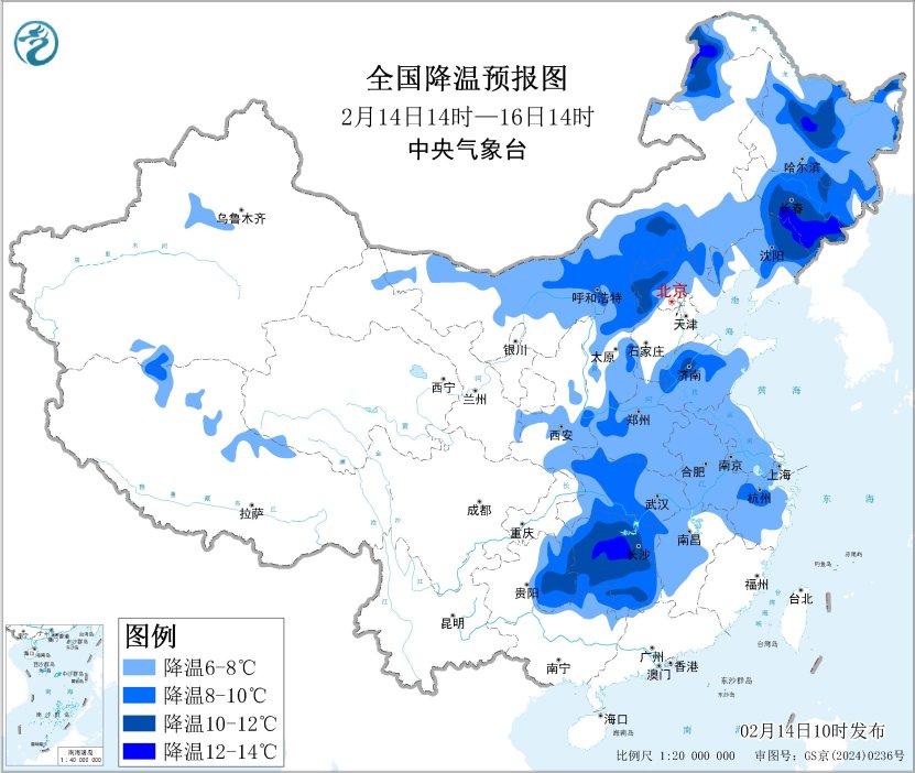 预计,2月14日14时至16日14时,内蒙古中东部、东北地区大部、华北大部、黄淮、陕西南部、江汉、江淮、江南北部和西部等地气温下降6~10℃,局地降温12℃以上。
