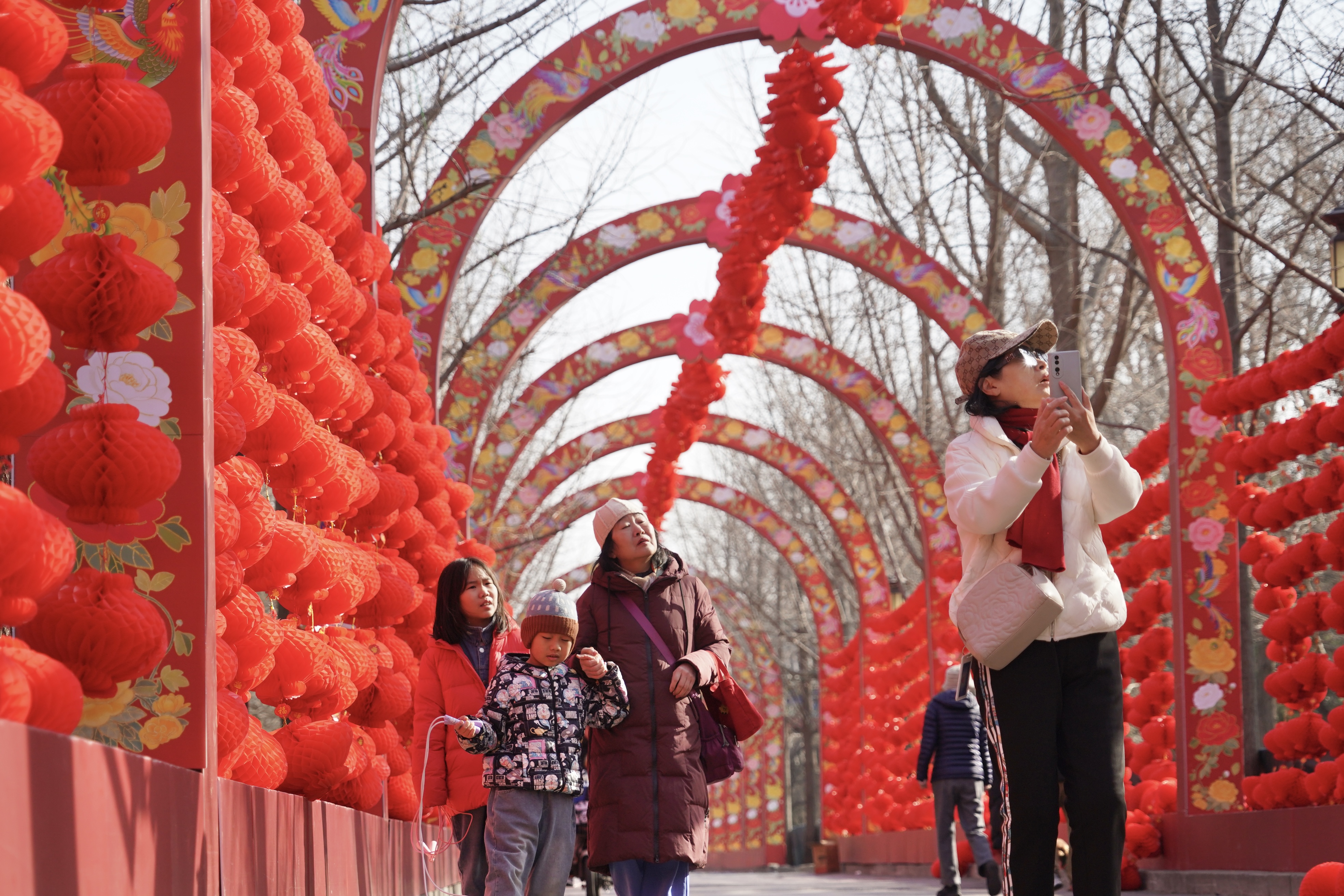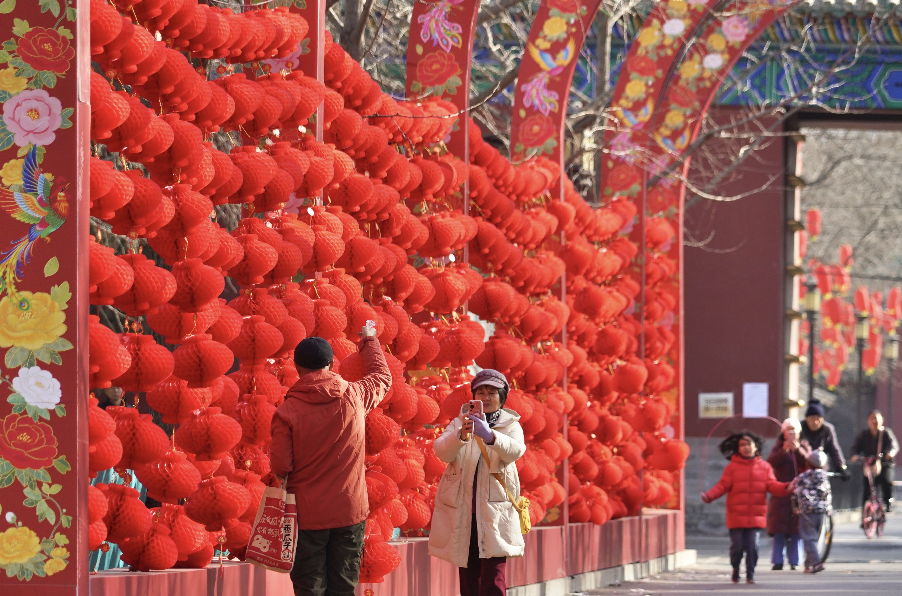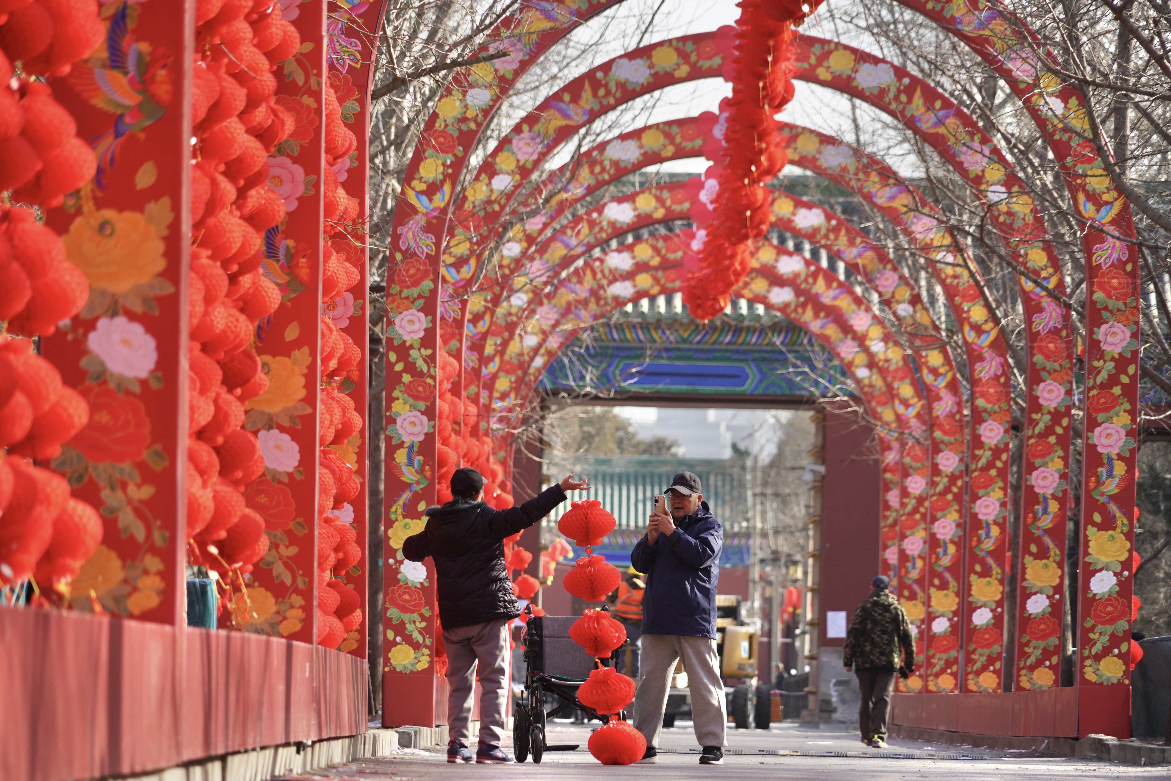 春节临近,地坛公园开始闭门换装,进行庙会布置。游客在布置好的西门景观大道拍照留念,提前开启庙会模式。