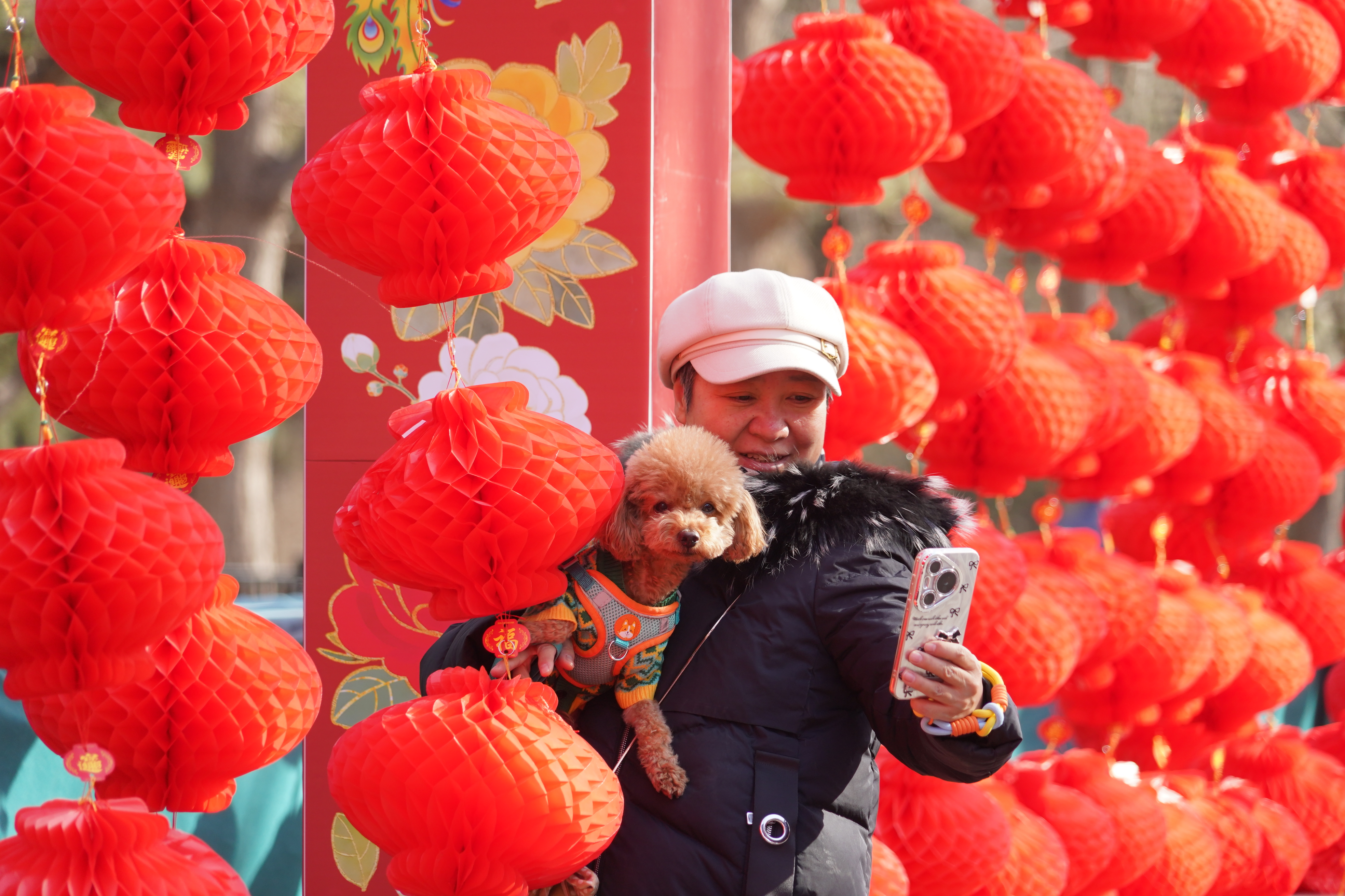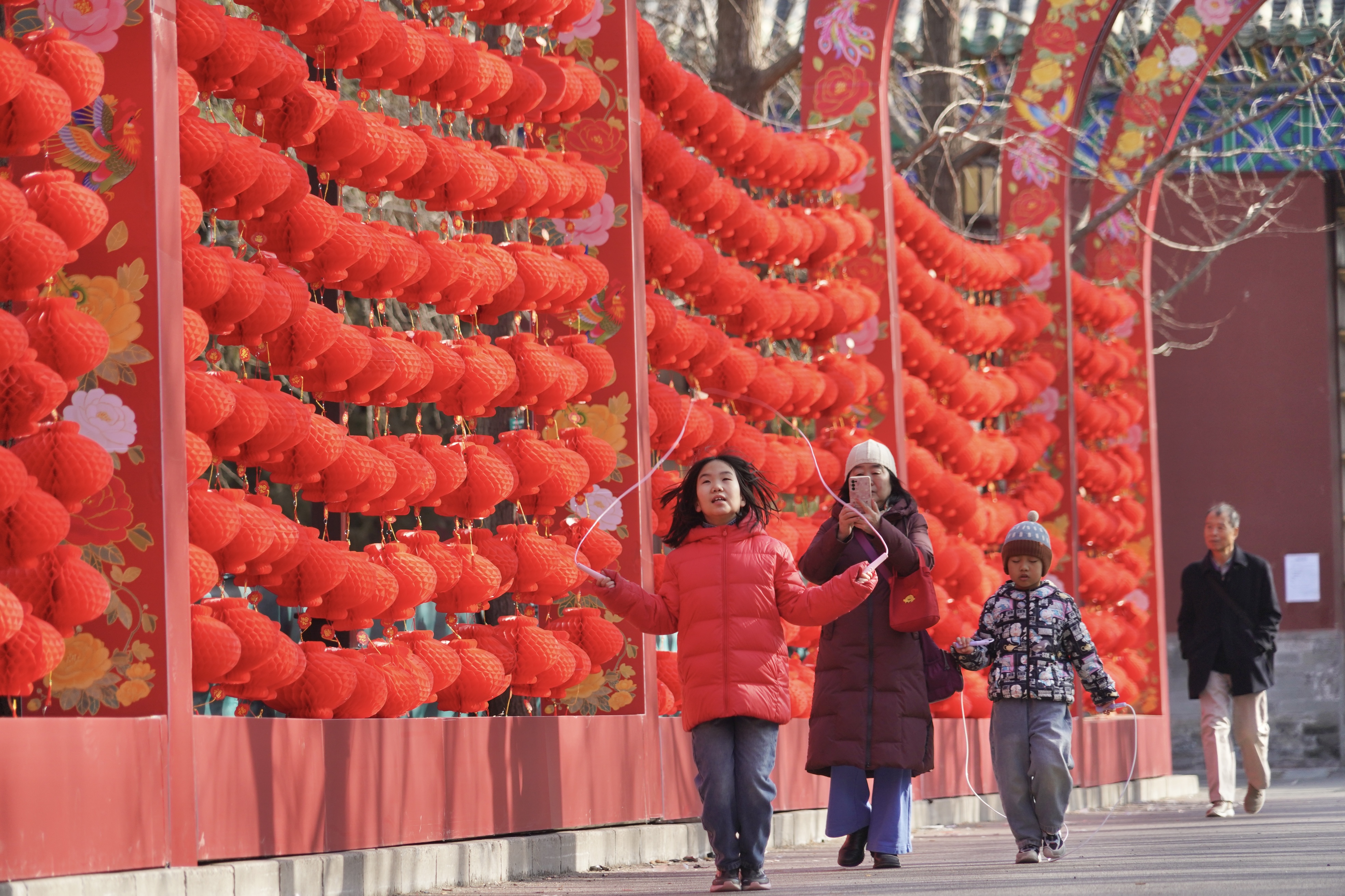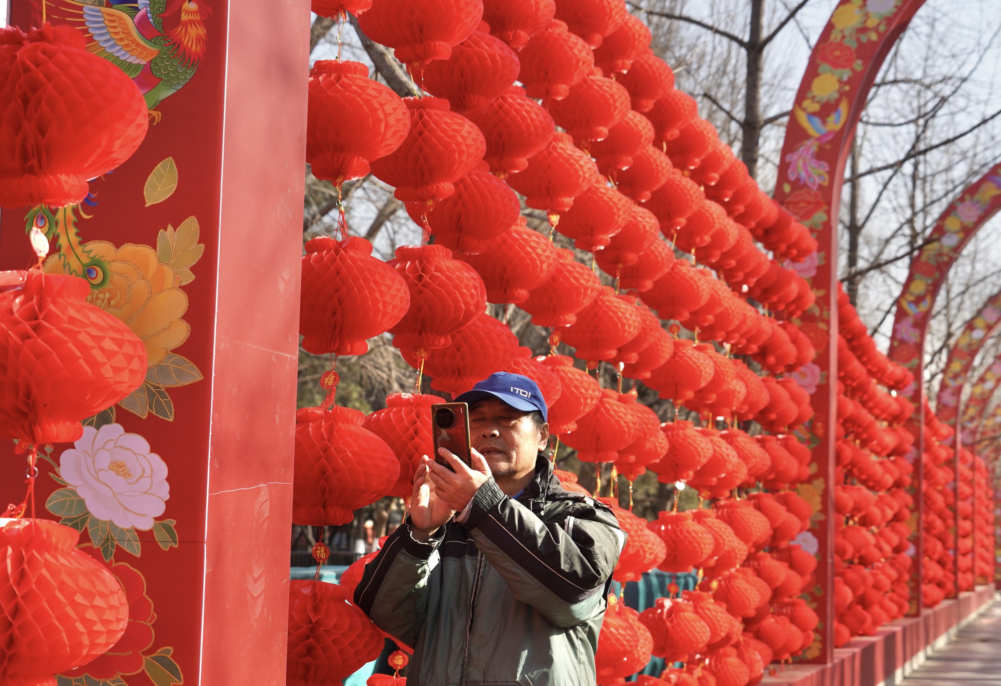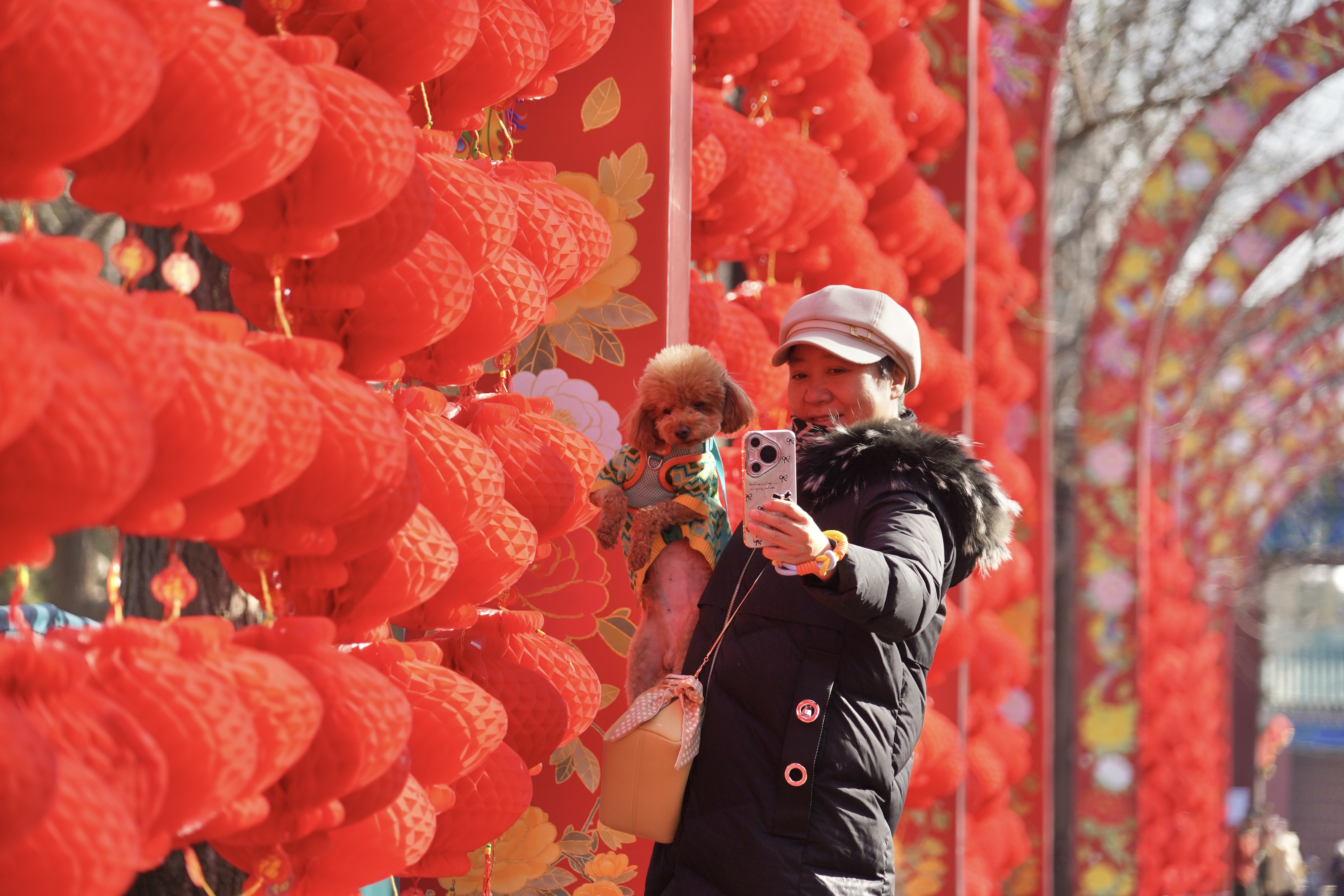 春节临近,地坛公园开始闭门换装,进行庙会布置。游客在布置好的西门景观大道拍照留念,提前开启庙会模式。