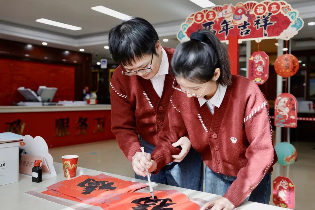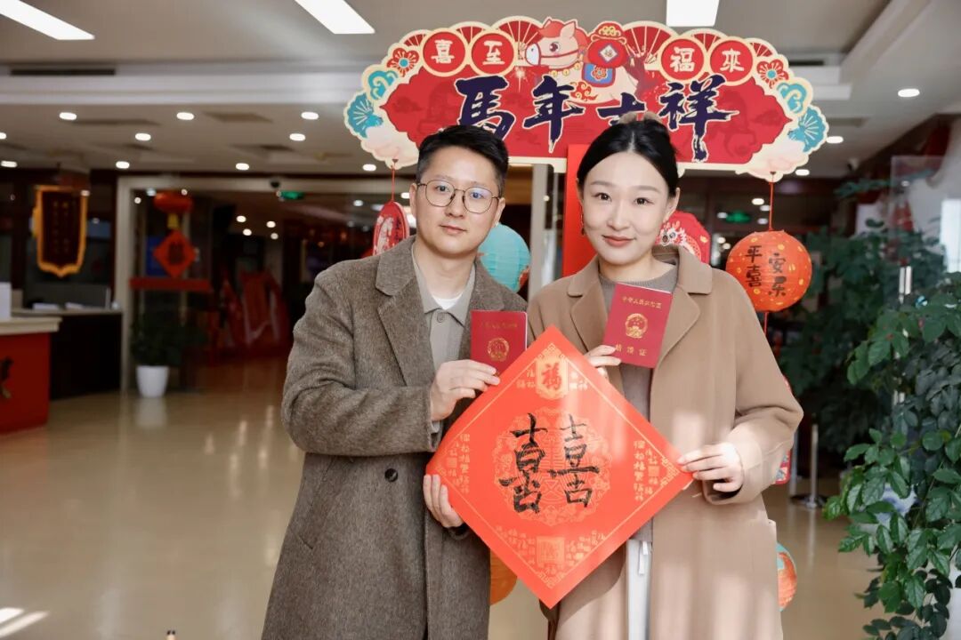 新人可前往西城区民政局婚姻登记服务中心(南新华街58号三层)办理婚姻登记业务,婚姻登记服务中心已提前做好全面筹备,优化办理流程、增派工作人员、增设服务窗口,精心打造充满春节元素的中式浪漫场景,布置温馨装饰、营造浓厚甜蜜氛围。同时现场开展“巧手剪双囍”非遗体验、颁证厅宣誓等特色活动,工作人员全程提供材料预审、引导咨询等贴心服务,确保新人高效完成结婚登记手续,用专业便捷的服务为新人的幸福旅程保驾护航。