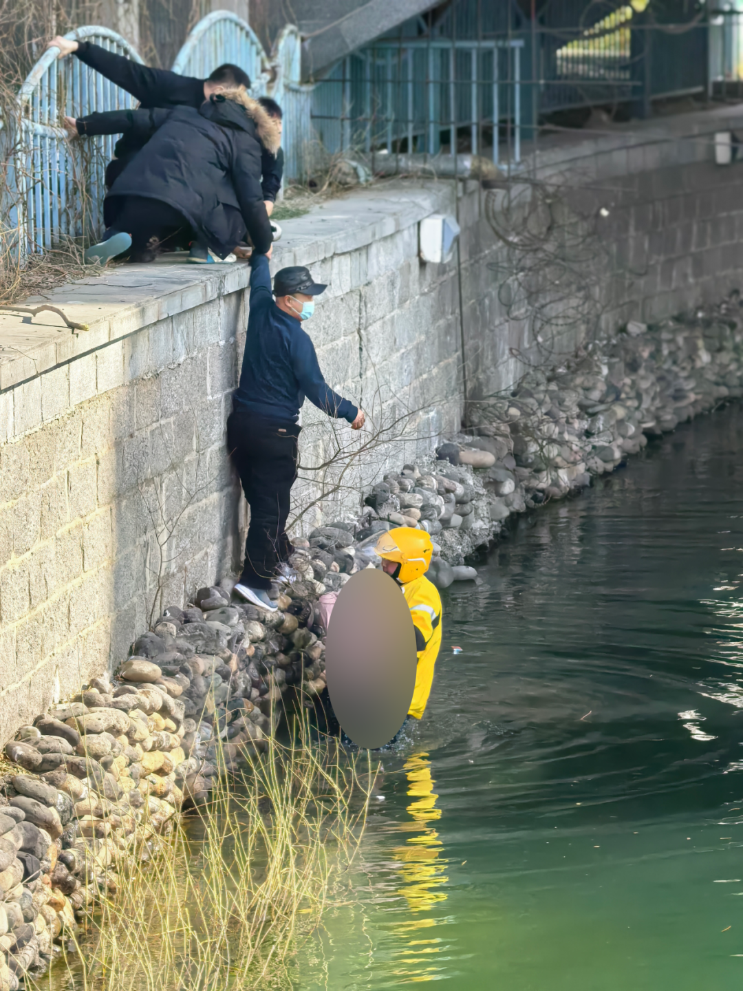 张蒙蒙跳入冰河后,现场围观的群众迅速接力组成救援力量。德胜居民李武送13岁的孩子回家时路过现场,第一时间拨打110报警电话,和孩子一起呼喊“救人”。随后,李武将手机交给孩子跟警方保持联系,翻过栏杆来到岸边。危急关头,又有3位热心群众陆续来到岸边,其中一人下到岸边踩在鹅卵石护砌处伸出援手。随后120、119赶到,在大家的通力合作下,终于将落水者成功抬上岸。