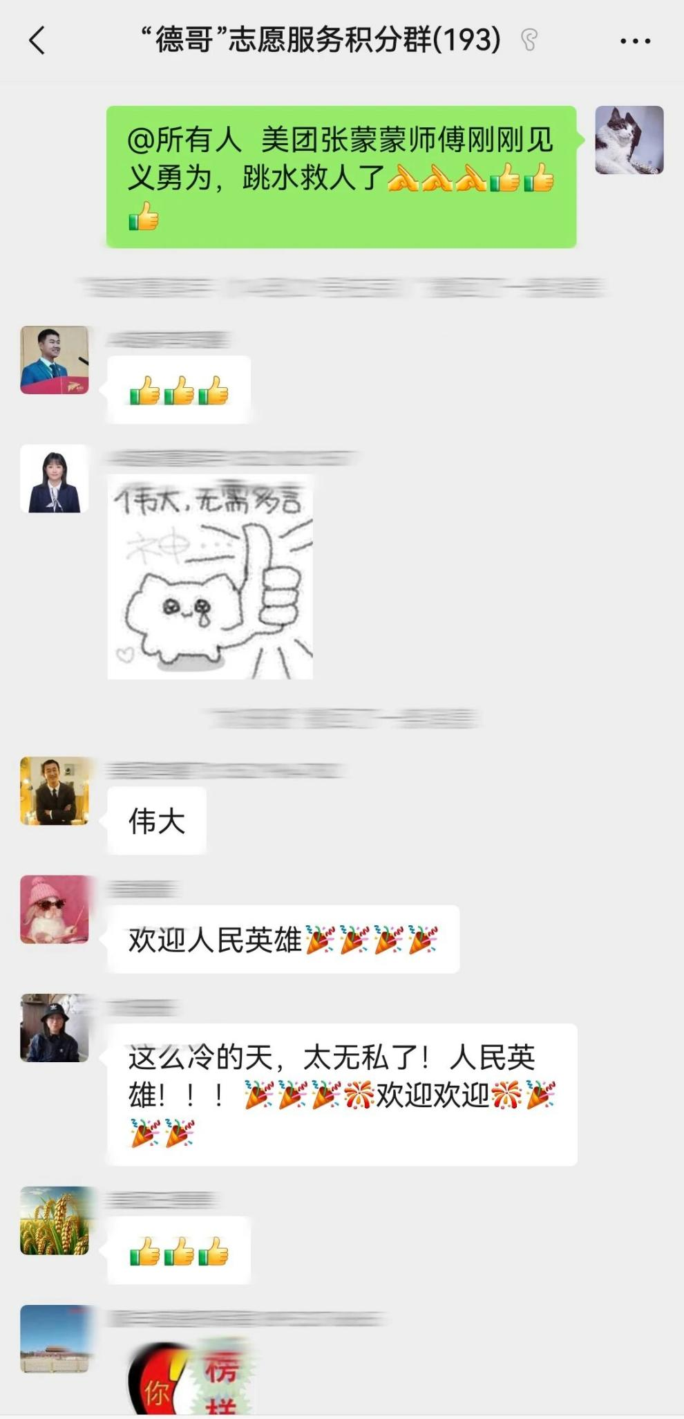 张蒙蒙救人的现场照片被转发至“德胜小哥积分群”后,顿时传为佳话,认识他的群友纷纷惊叹点赞:“这不是前两天刚加群的小哥吗?”“真爷们儿,这么冷的水说下就下!”……在德外大街西社区居民发布的朋友圈中,“90后”张蒙蒙的见义勇为也赢得了无数点赞。
