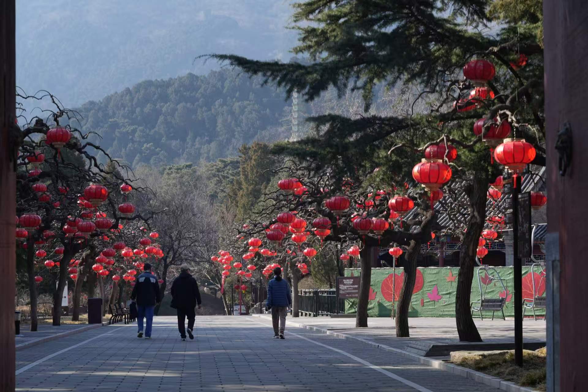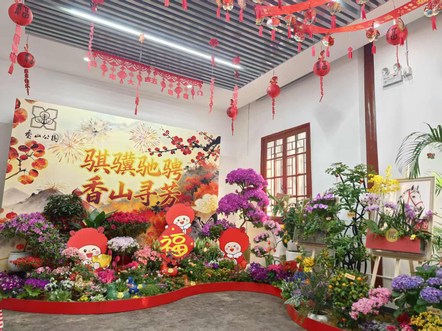 走进香山,东门“马跃香山”主视觉互动装置喜气迎人,主干道、核心景点悬挂灯笼千盏,中国结、五福装饰与主题道旗点缀其间。佳日园及沿线布设梅花2000枝,雅致花境与古典园林相映成趣。