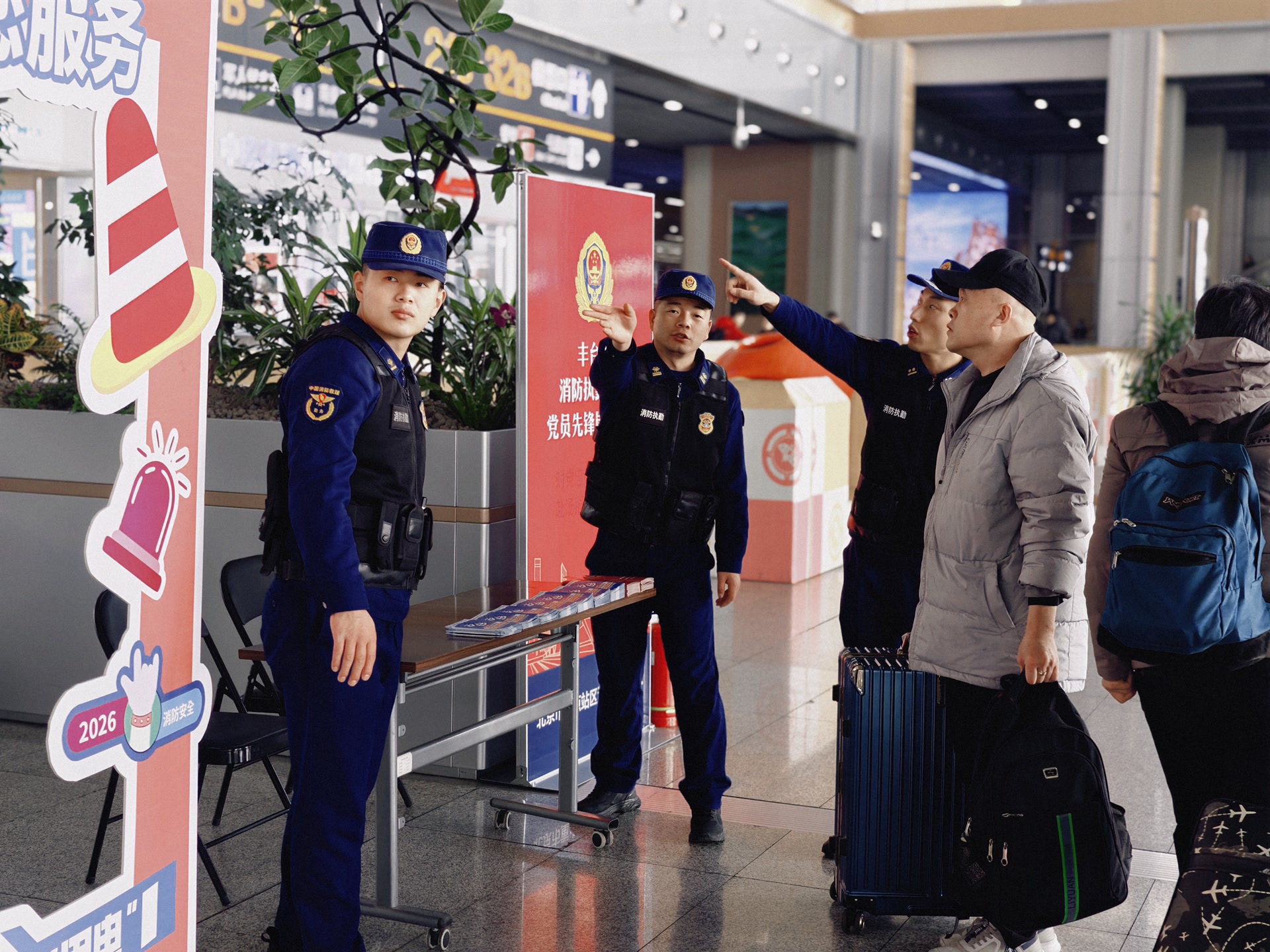 据悉,北京市重点站区消防救援支队在“八站两场”设置了党员先锋岗、党员服务队,开展消防巡查、检查、宣传咨询、引导大客流疏散和帮扶困难群众等保障服务,他们有的搀扶老人、引导旅客、答疑解惑,暖心话语让旅途更有温度。有的手持宣传资料,向旅客与工作人员讲解冬季防火、禁带危险品、火场逃生等知识,手把手教学灭火器使用方法,把“平安年货”送到旅客身边。