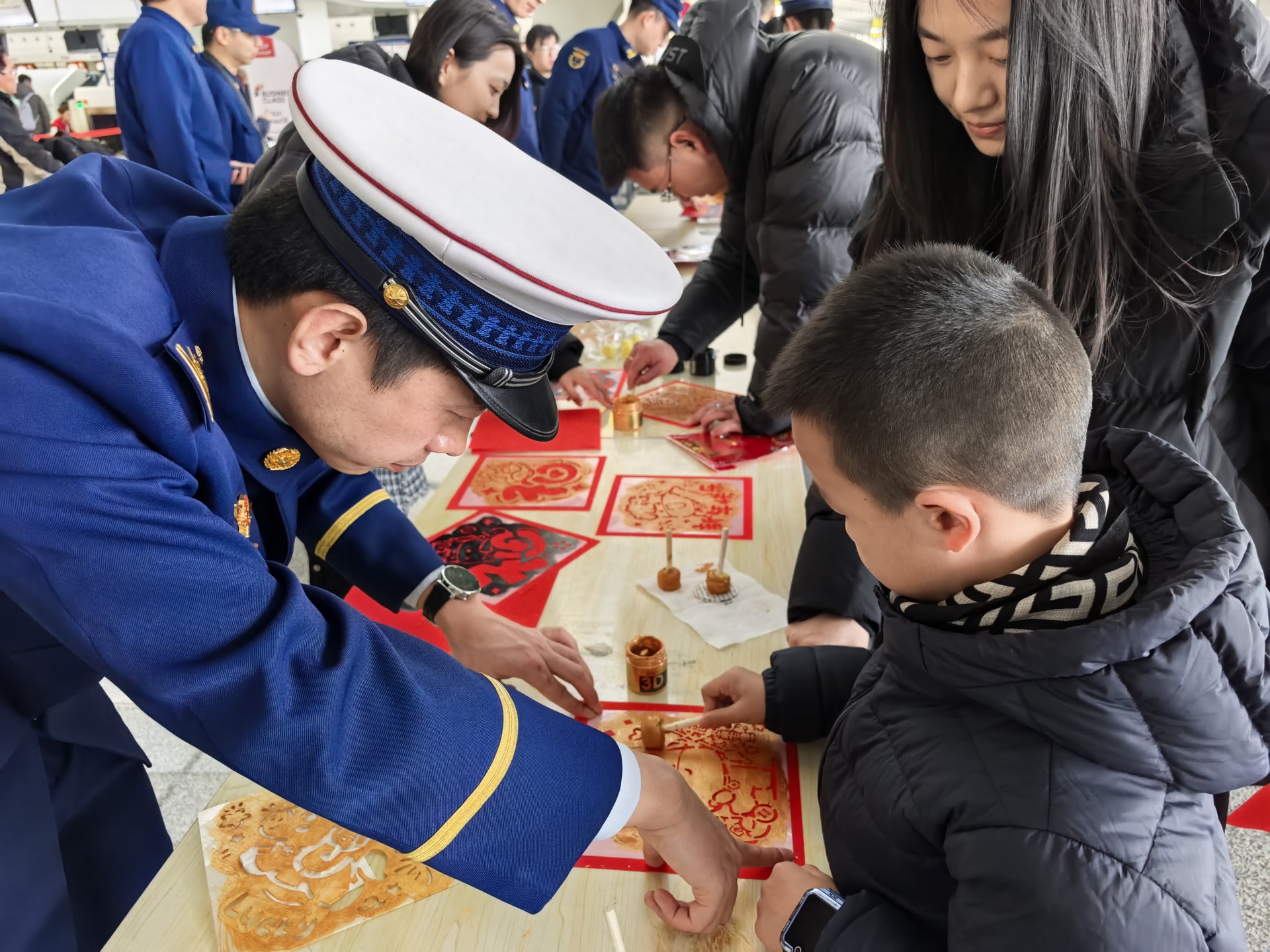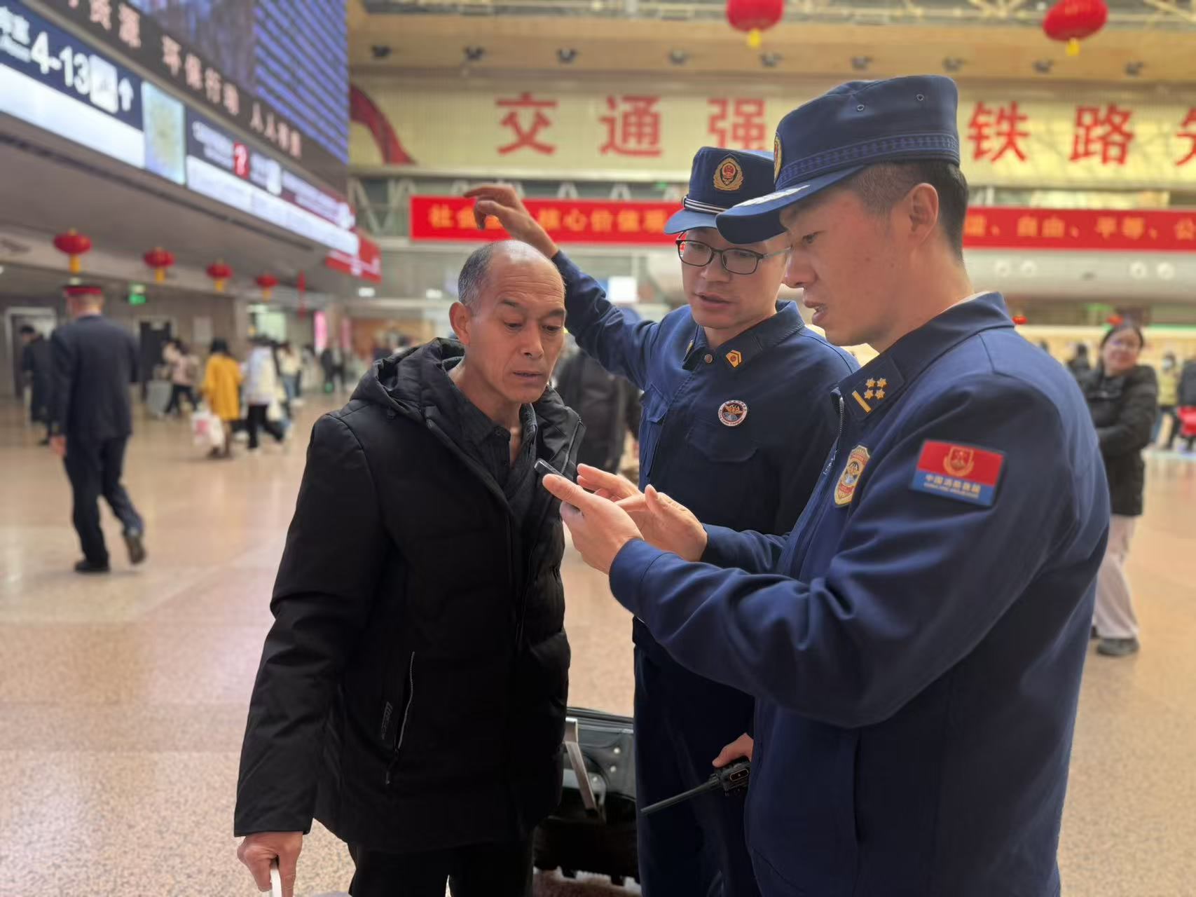 “请您关注消防安全,祝您新年快乐。”“小朋友,跟着指示牌走,不要在通道奔跑哦。”“大爷,我帮您拎行李,这边是无障碍通道。”……在春运期间的重点时段,每日早8时至晚10时客流高峰时期,一抹抹“火焰蓝”准时出现在北京各大火车站、机场的候车厅、换乘通道、站前广场,“火焰蓝”队伍穿梭在人群中,成为春运路上一道让旅客安心的风景。