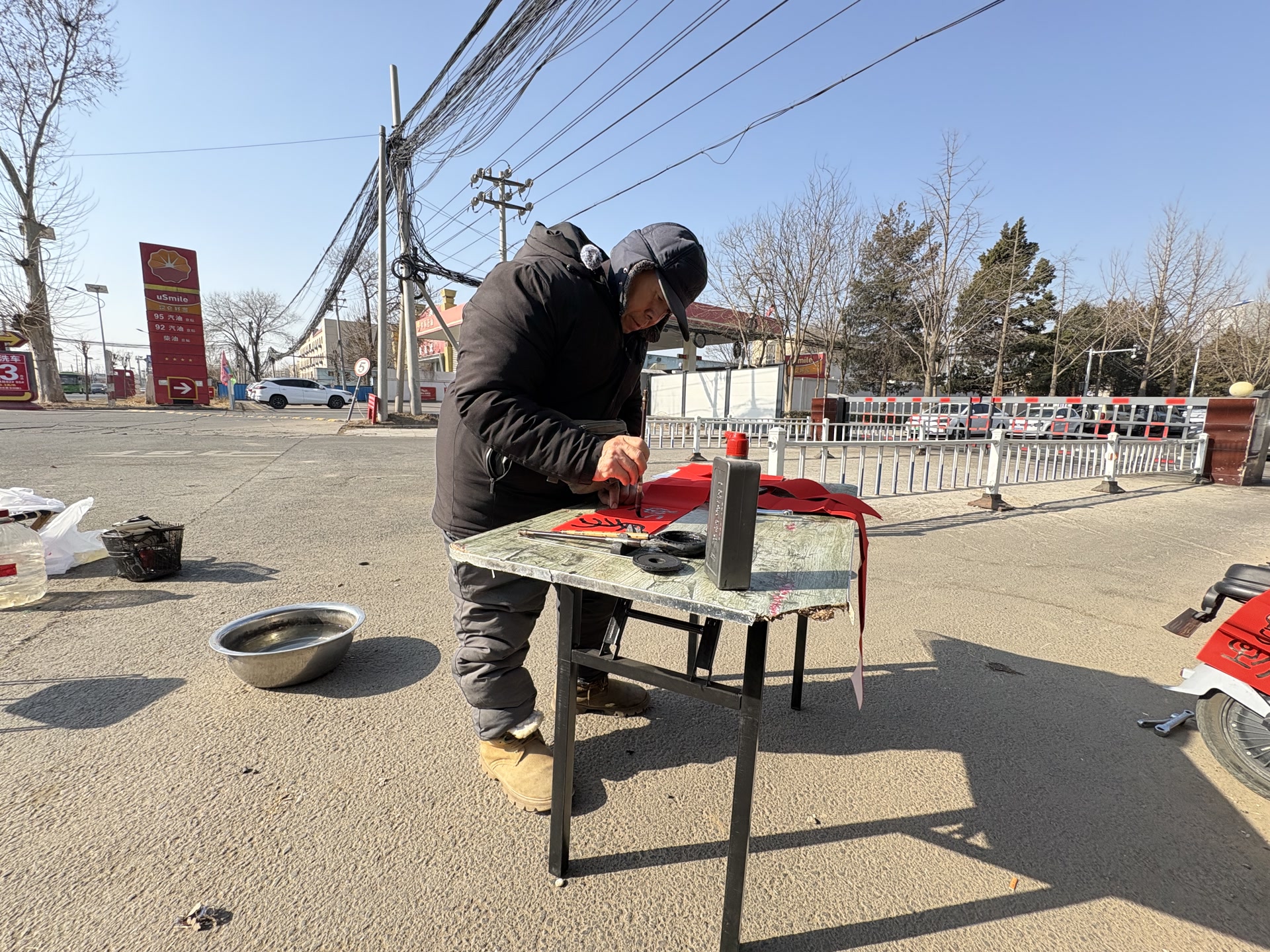 冬日午后,房山良乡南关凯旋大街街边,修车摊旁摆着一张折叠书桌,机油味混着墨香。摊主李克泉修完一辆电动自行车,擦了擦手,转身提笔,在红纸上写下一个“福”字,字迹遒劲。旁边几本书法字帖在风里翻页,哗啦作响。