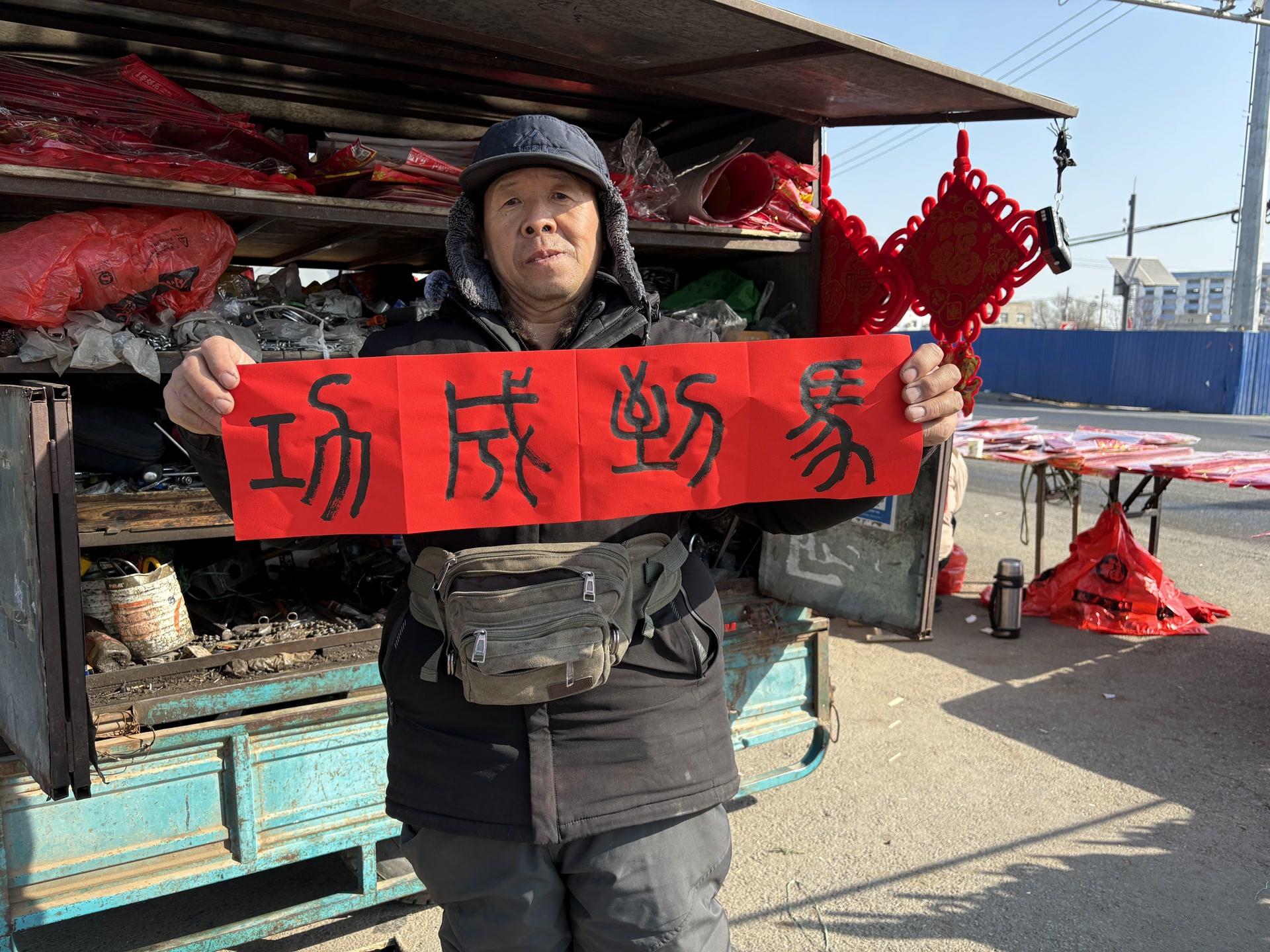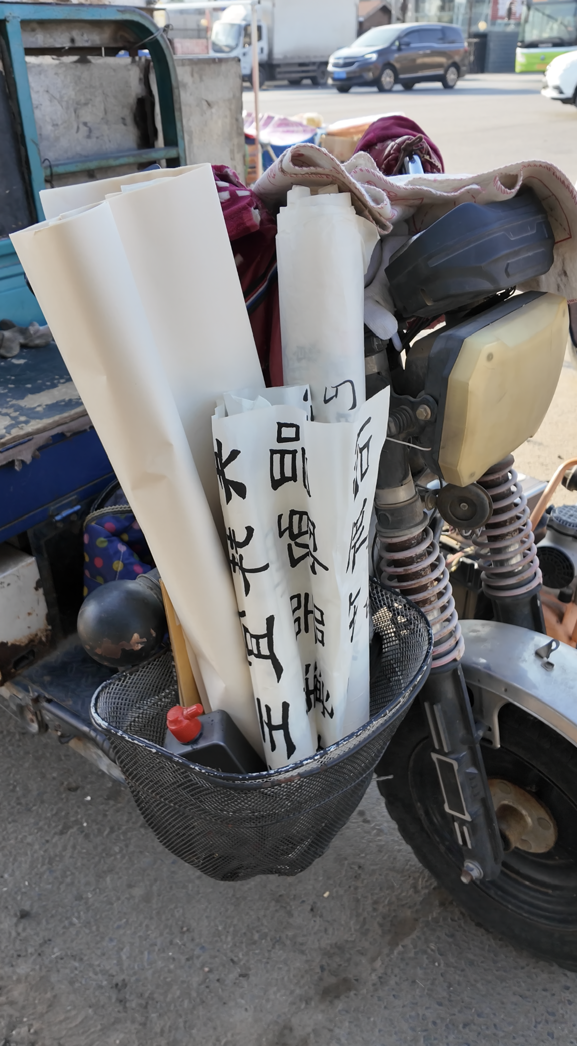 临近中午,李克泉摊前的顾客越来越多,他把写好的字卷起来,插进三轮车车筐里,又弯腰修起电动自行车。这个街角,依旧车来车往。宣纸在风里轻轻晃动。
