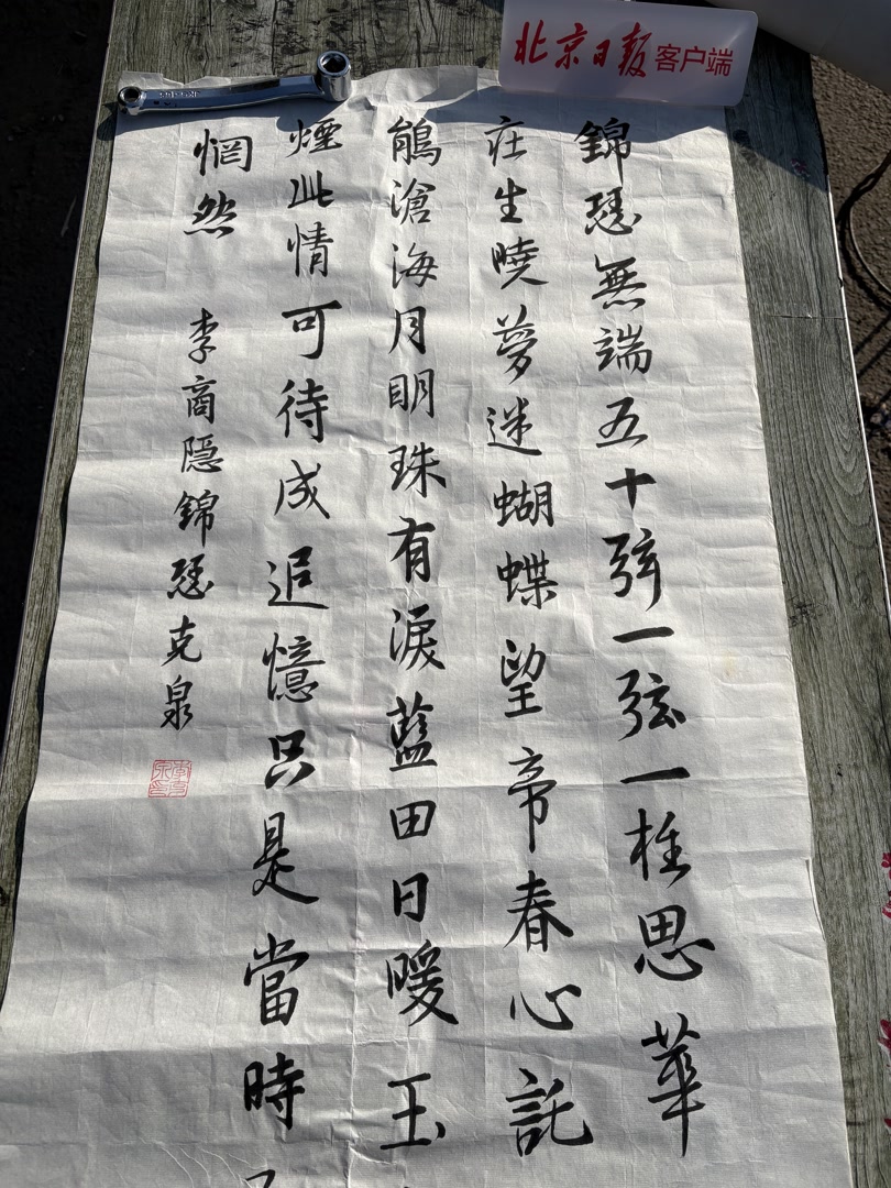 2008年,李克泉搬到北京房山,在良乡南关摆起修车摊。最初,他白天修车,晚上回了出租屋才开始练字;后来,他索性买了一张折叠桌摆在修车摊旁,得空便练字。“练字上瘾,一天不写晚上都睡不着觉,总感觉缺点啥。来北京十几年了,练字从没间断过。”