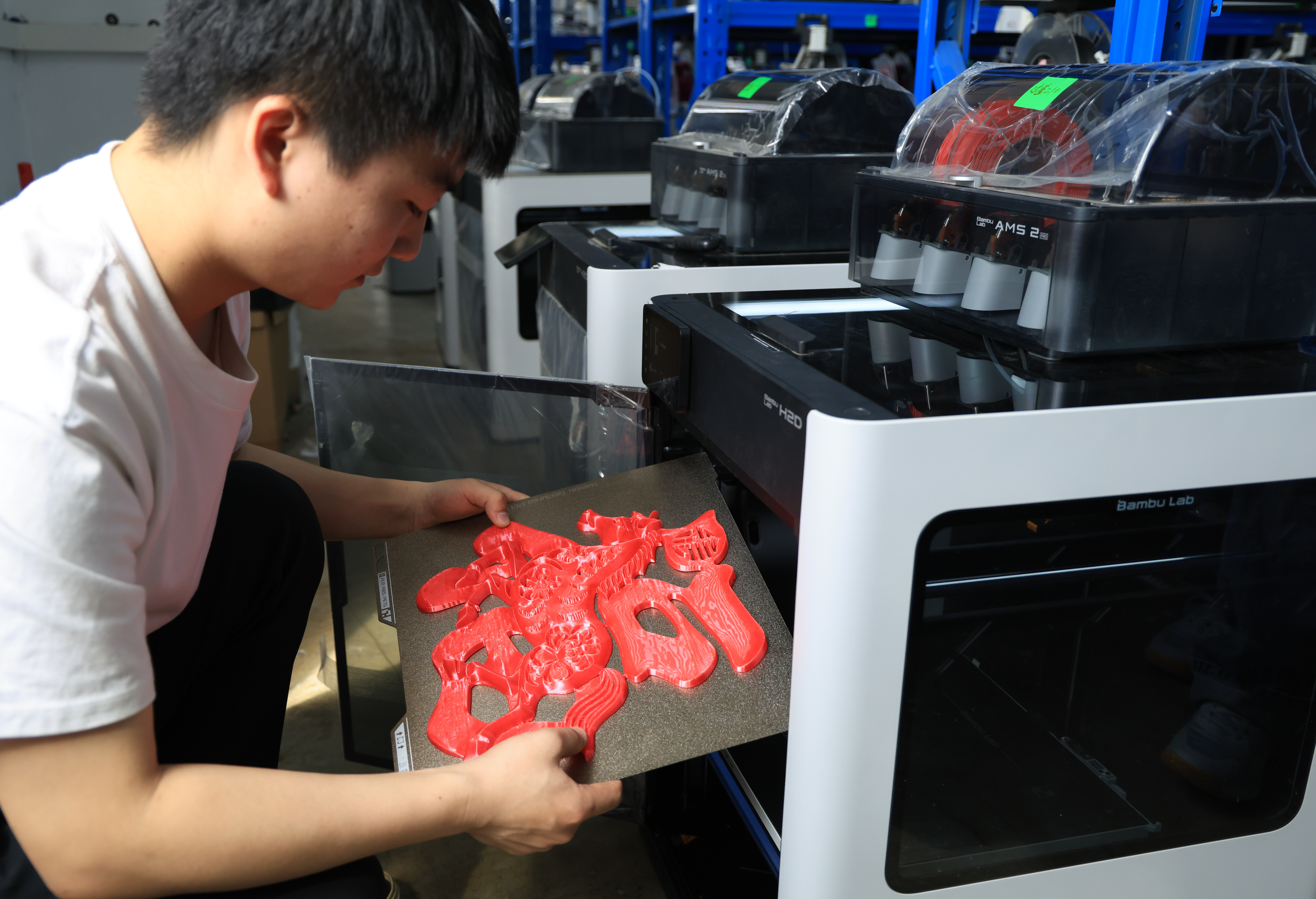 “农场”的工作,往往从“收菜”开始。“收菜”是3D打印行业对收取打印成品的别称。3D打印步骤包括设计、切片、导入、装材、收取、包装等,前几个步骤有专门的人员负责,可以远程操作,“耗材安装、‘收菜’、包装以及器材清洁维护则由现场技术人员操作,一人大概负责100台3D打印机。”杨盛武告诉记者。
