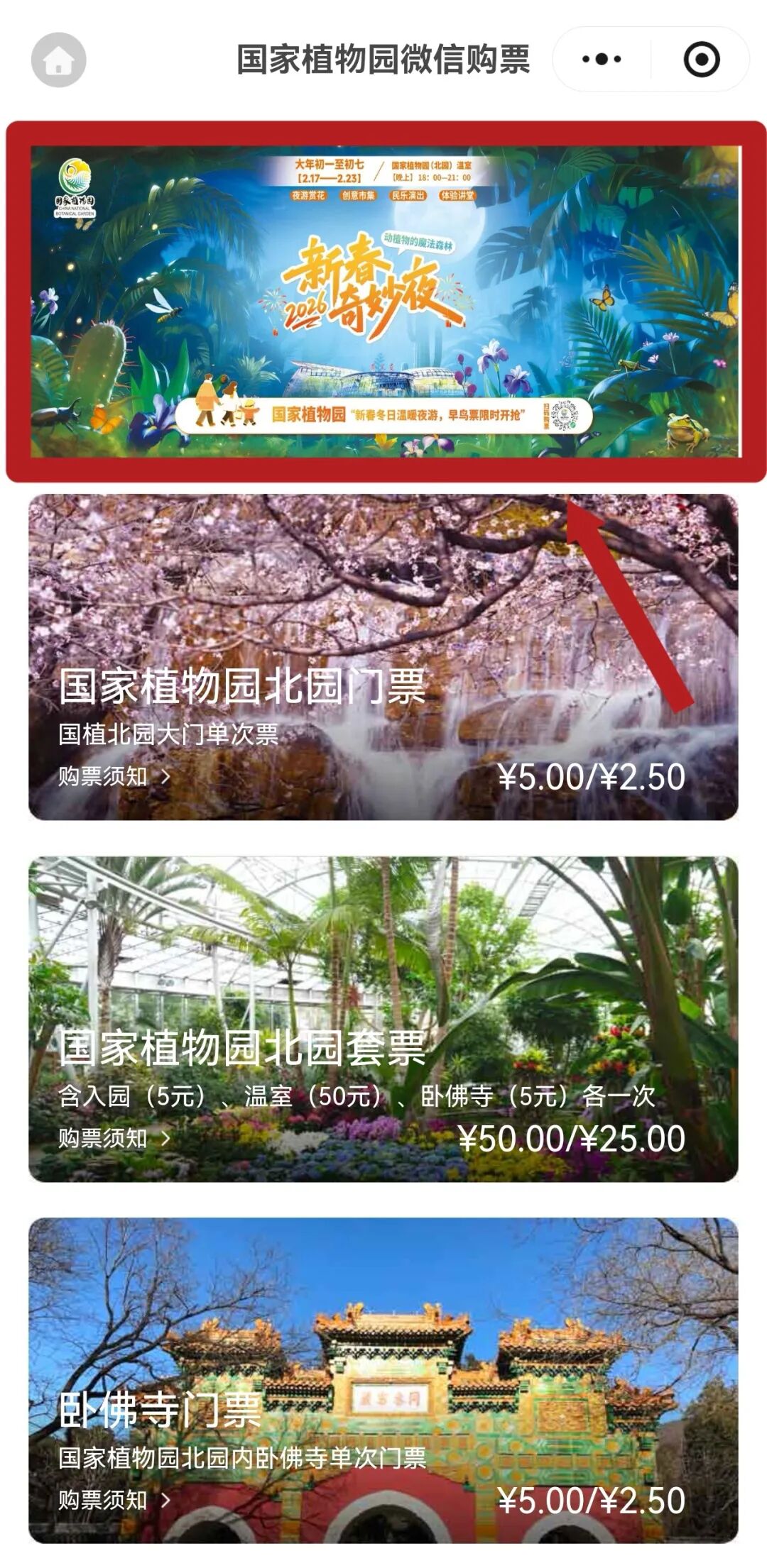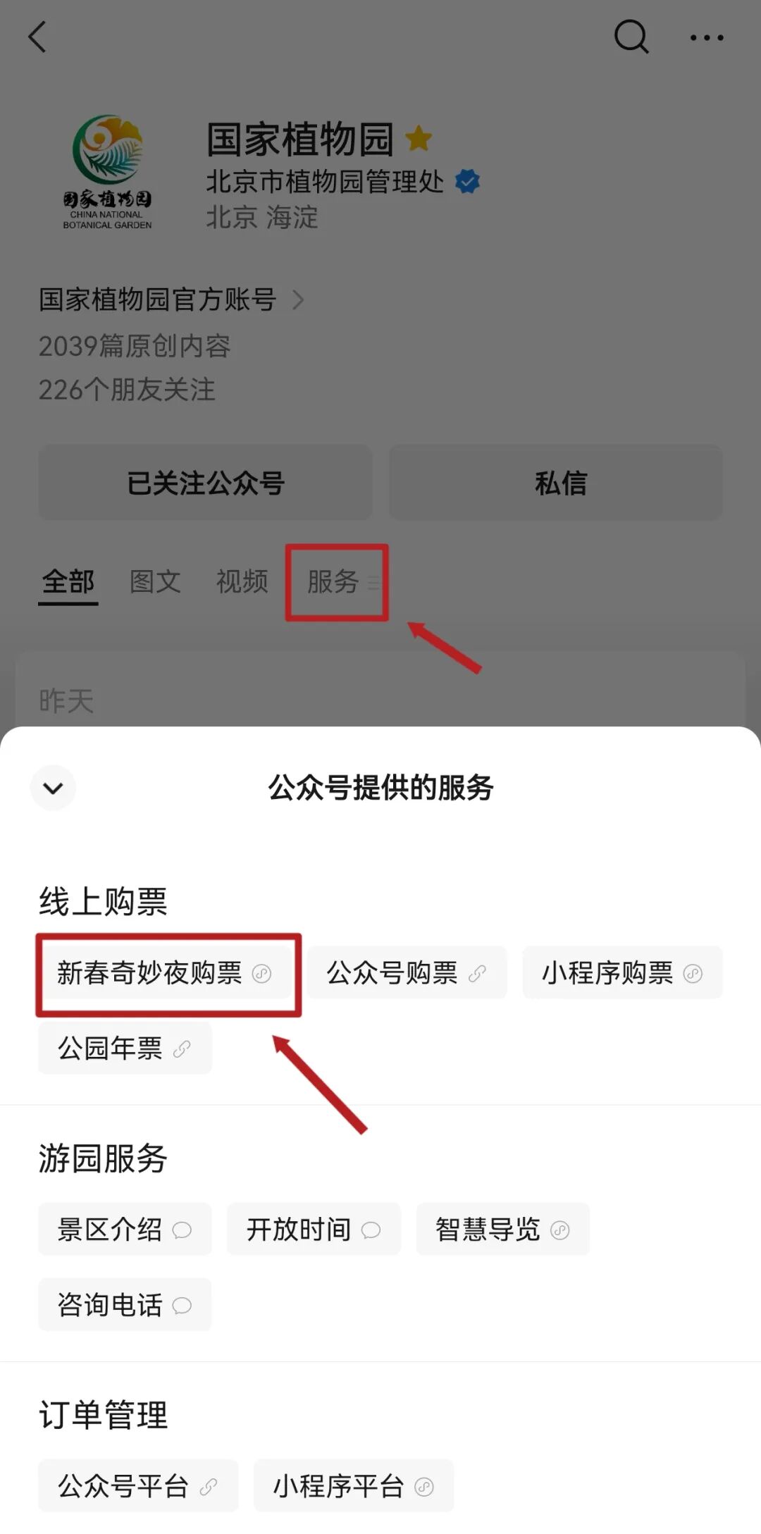 1.关注国家植物园微信公众平台,选择服务菜单点击新春奇妙夜购票选项。