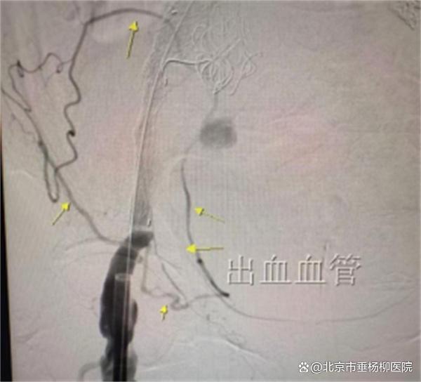 在患者经由急诊绿色通道直送导管室后,由杨永久、丁旭、郑新颖以及导管室技师护士组成的治疗团队随机开始急诊抢救手术。术中,患者仅能在高剂量血管活性药物支持下将血压维持在100mmHg左右,手术操作难度大。团队依次完成病变血管评估、髂内动脉栓塞、支架主体及髪支支架植入。术中探查发现,患者除主髂动脉瘤破裂出血外,腹壁下动脉和旋髂浅动脉仍在持续向右侧破裂的髂动脉瘤腔供血,属隐蔽性出血源。杨永久果断采用微导管超选择技术,精确定位并封堵两支出血血管,完成主髂动脉腔内隔绝治疗。