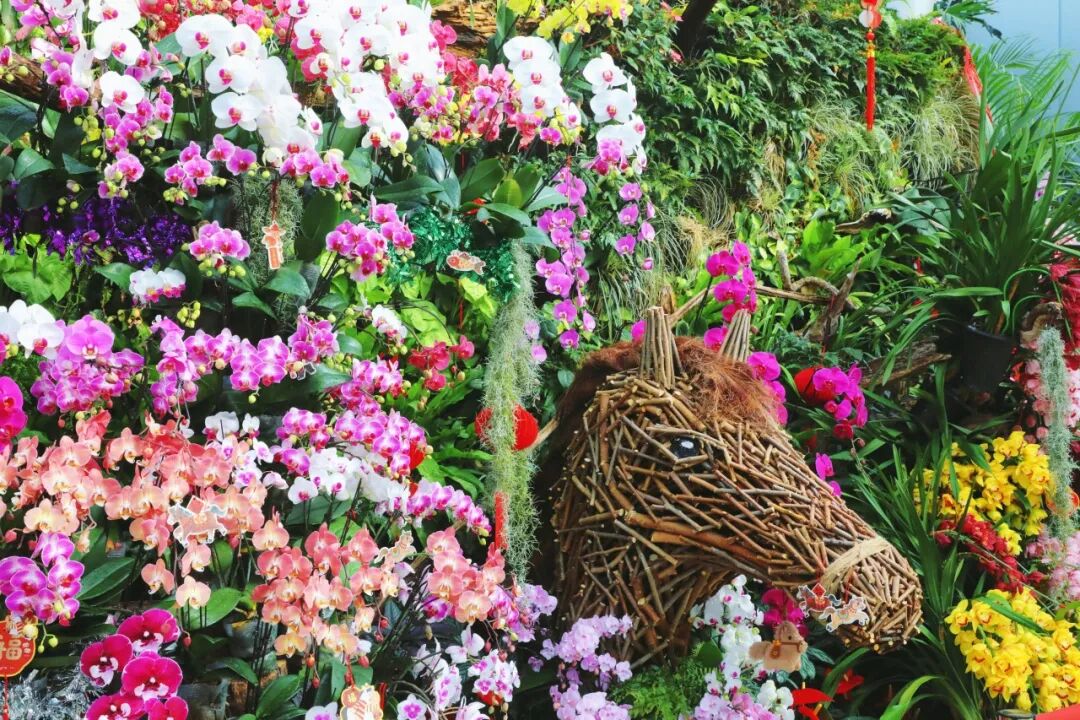 中心花园区一辆通体被兰花装饰的南瓜马车静静伫立,成为整场视觉焦点。车身围绕装饰着灿烂热烈的兰花,素净淡雅的石斛兰、馥郁绵长的蝴蝶兰、挺拔俊秀的蕙兰,与凤梨等年宵花交错排布,将童话的浪漫与兰草的清雅完美融合,呼应了新春的吉祥寓意,又为梦幻场景注入热烈生机。