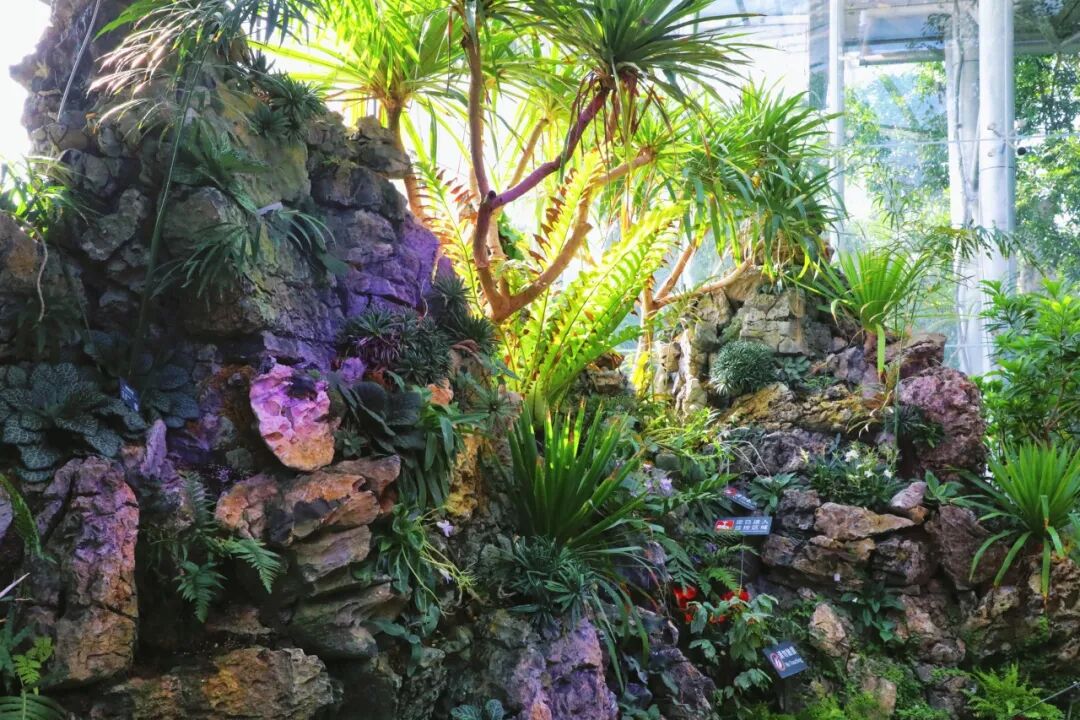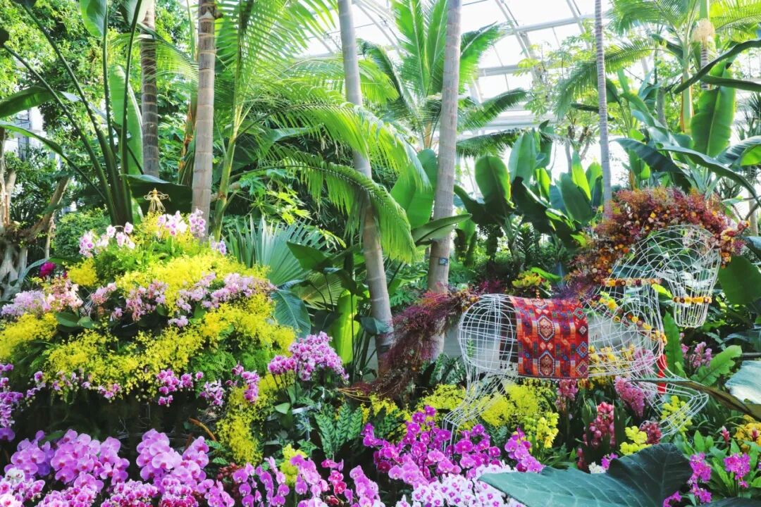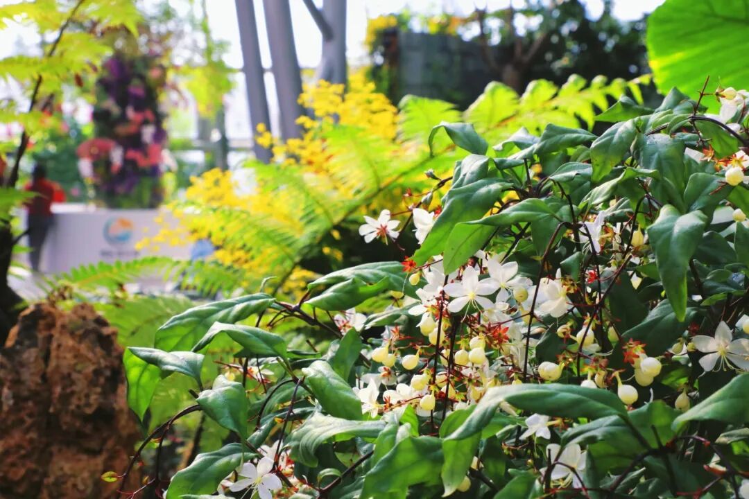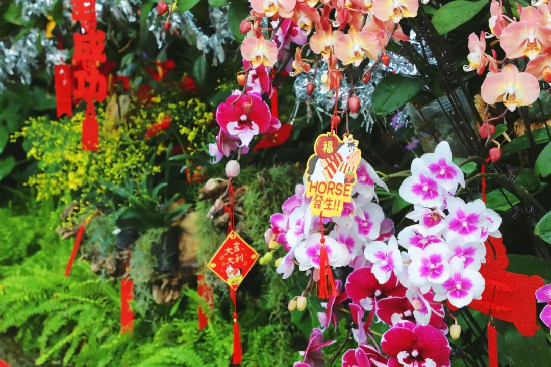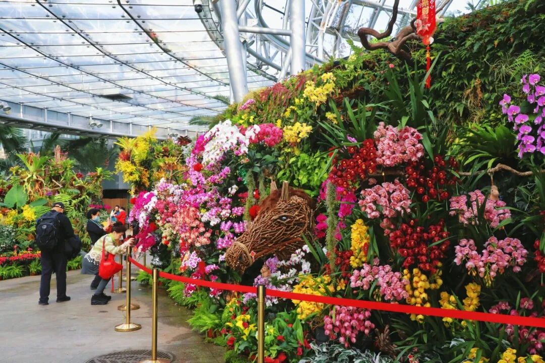 景观岛区内有各色蝴蝶兰、文心兰、卡特兰,还有壮丽鹿角蕨、蝴蝶鹿角蕨、马尾杉、粗糙马尾杉、龙骨马尾杉等,营造出“马”跃兰溪的植物盛景。
