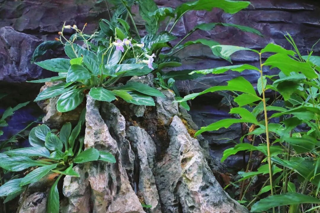 幽谷兰境区以湿润的苔藓、层叠的青石、潺潺的溪流,构建一个静谧而充满生机的森林入口,通过精巧的造景,模拟空中、地表、石壁等不同生境,展示兰花为了生存而进化出的奇妙形态。