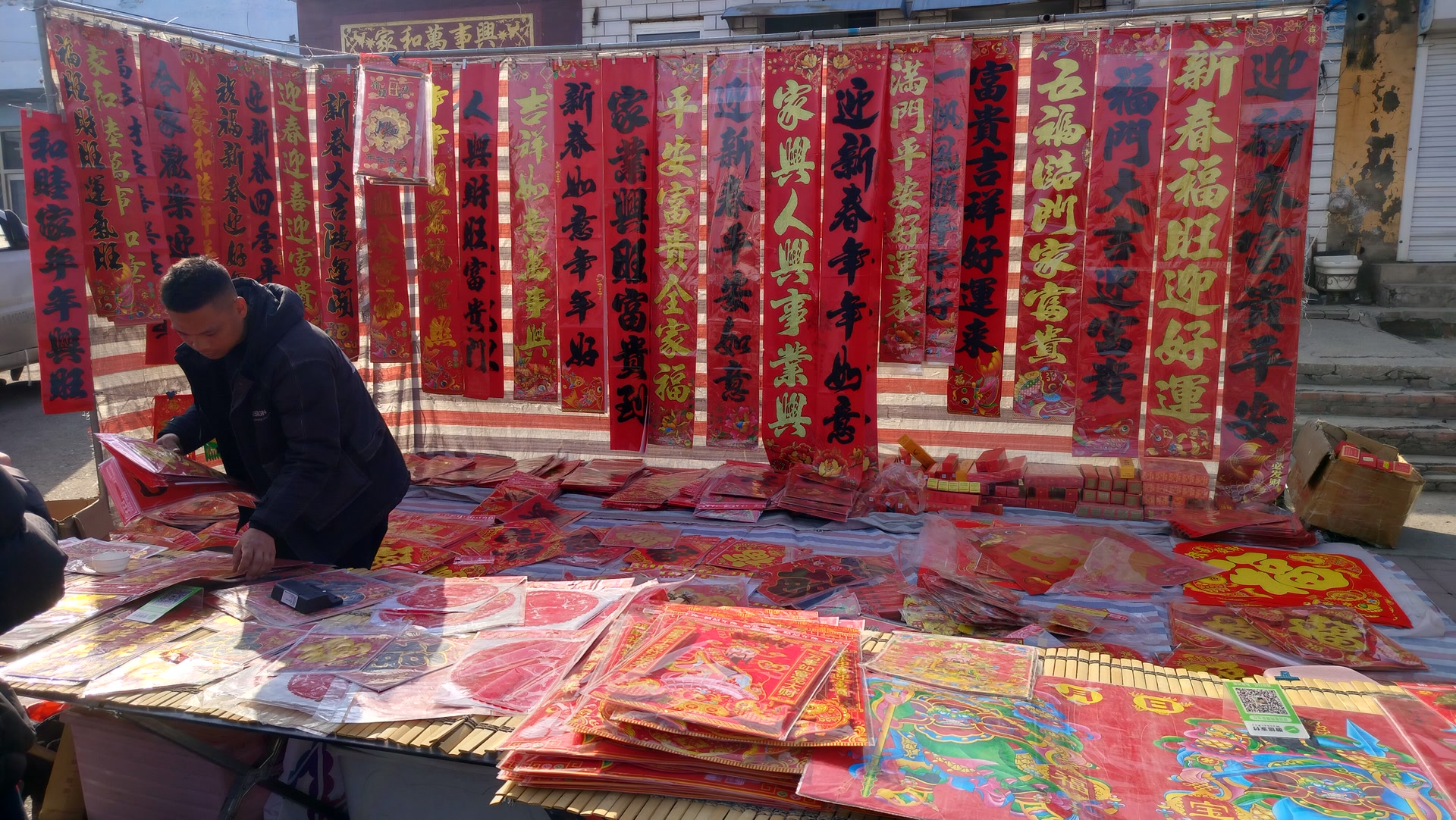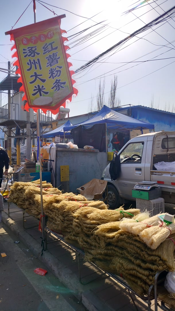 商户各地的都有,汽车上的大白菜是涿州人拉来的,涿州的粉条也比较受欢迎;白洋淀的咸鸭蛋十块钱一袋,十个。
