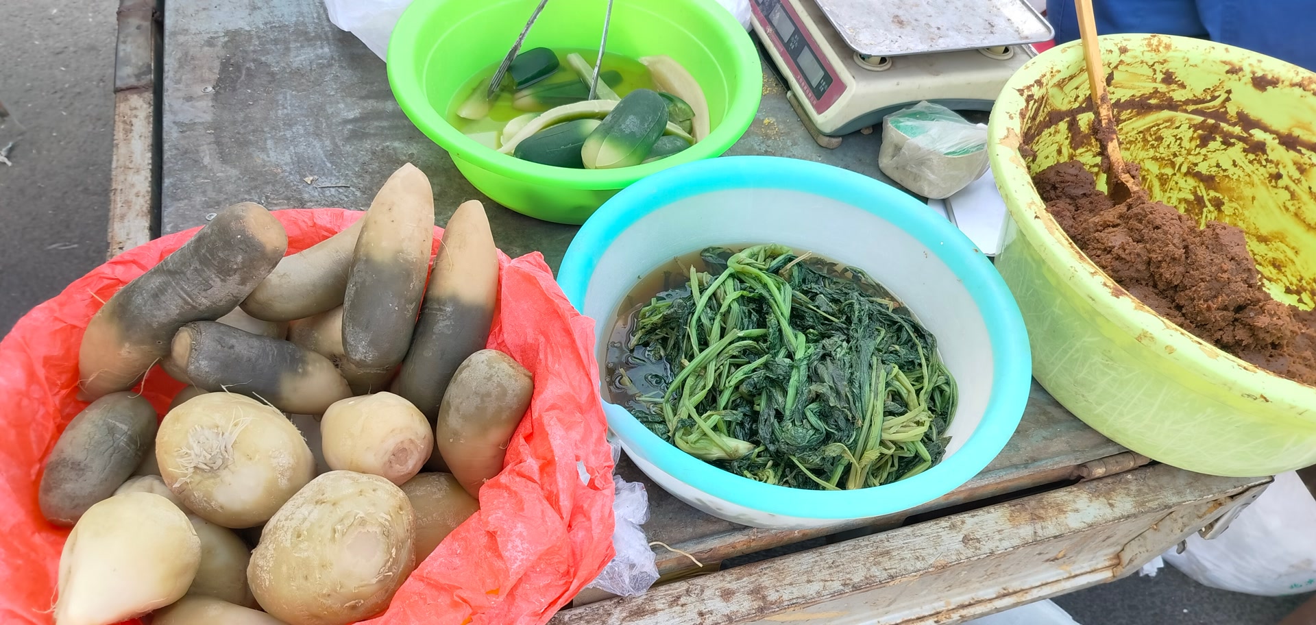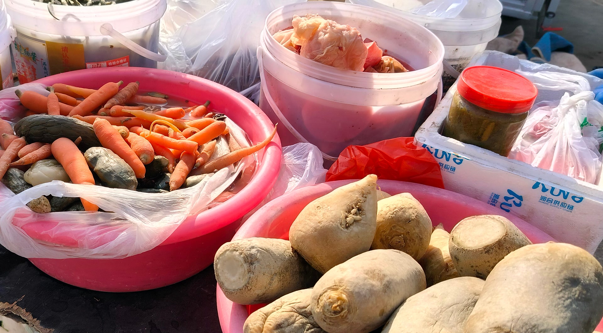 大集上有特色的是各种自家腌的咸菜,村民家备着几口大缸,腌的咸菜也是自家种的萝卜、雪里蕻、鬼子姜啥的,还有自制的黄酱,不过多数商户家的咸菜咸的有点过分。