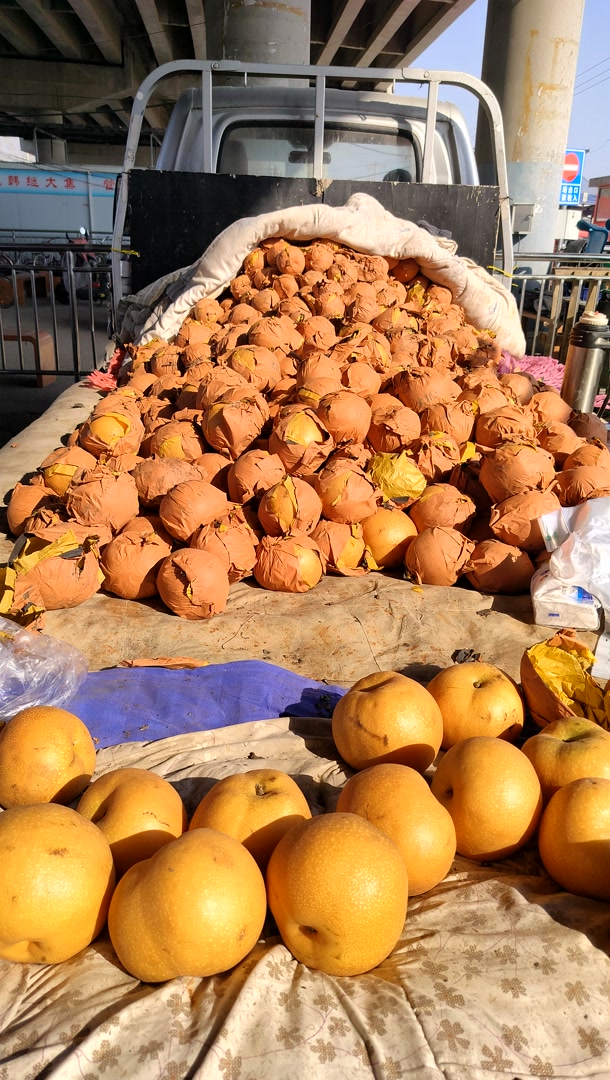 山东汽车运来的多是大葱、苹果、莱阳梨,他们也不卸车,大家直接在车斗里挑选。还有一些商户是附近村民,他们从批发市场批发来的货物到集市上售卖。