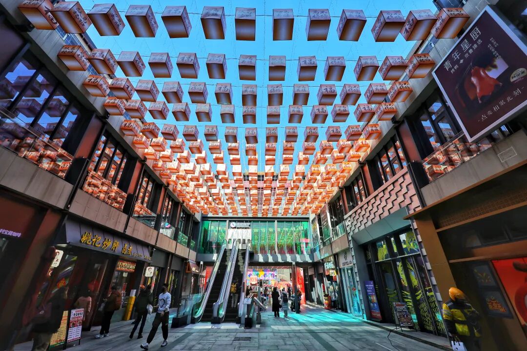 在这座古老街区中,胡同肌理、院落尺度、历史痕迹被一一保留,“修旧如旧”与“破旧立新”并存的空间手法,形成了一种独特的“胡同里的未来感”。青砖灰瓦的传统建筑群与现代设计的玻璃幕墙、空中连廊交织并立,老字号店铺的木质牌匾与潮流门店的霓虹灯光和谐共存。