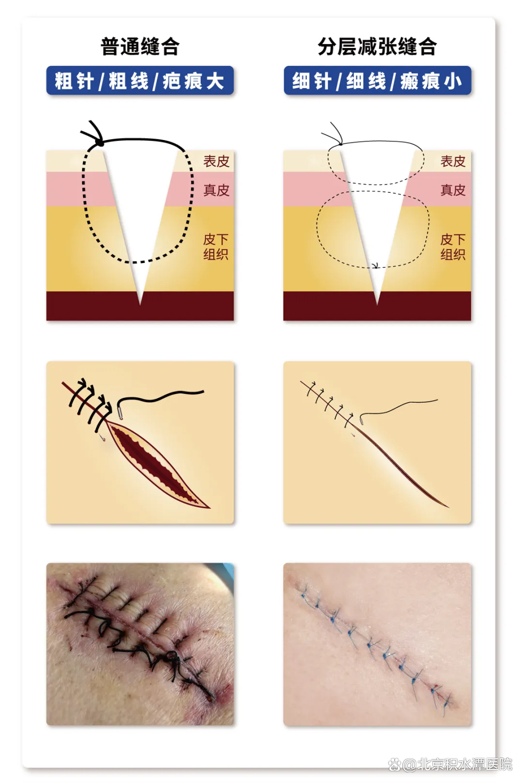 精细对位:美容缝合采用分层严密缝合,组织精确分层对位,创缘精细对合,有助于减少伤口张力,从而减轻疤痕的形成。