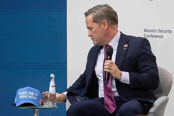 据@CCTV国际时讯 消息,当地时间2月13日,在德国慕尼黑安全会议的一场讨论会上,美国常驻联合国代表迈克尔·华尔兹现场展示了一顶印有“让联合国再次伟大”(MAKE THE UN GREAT AGAIN,MUNGA)字样的蓝色帽子,称这顶帽子很受欢迎。