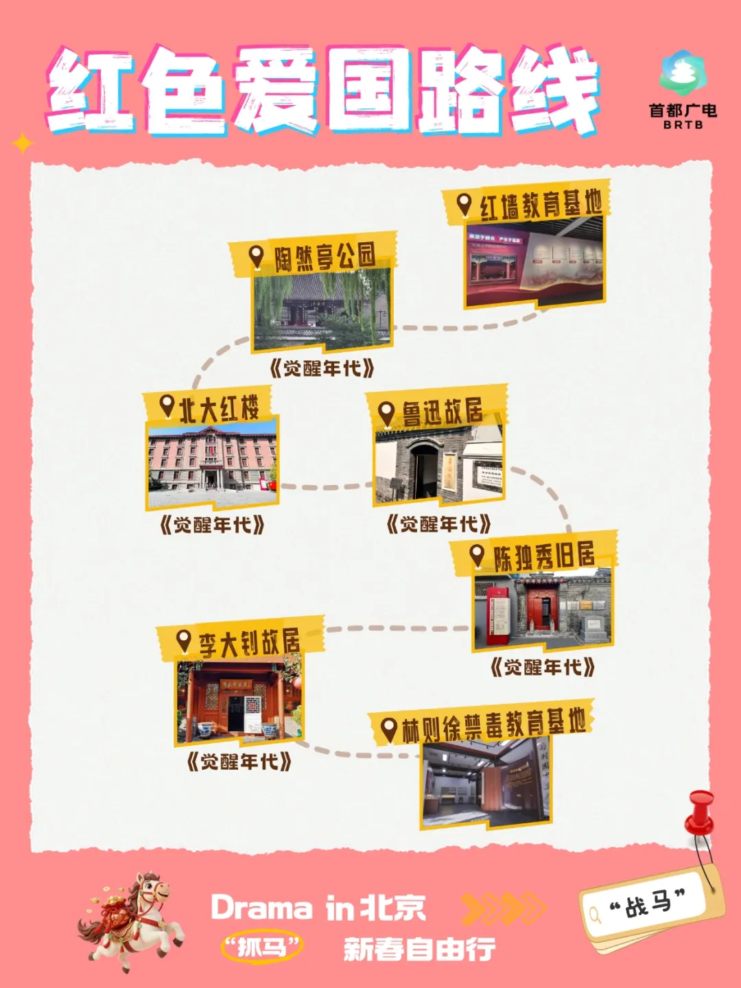 马年新春,北京市广电局推出“跟着‘北京大视听’游北京”系列12条影视取景地打卡路线。Drama(抓“马”) in 北京,新春自由行!你的专属影视吃逛地图——“❤️红色爱国线”正式上线啦!