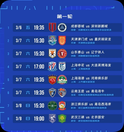 北京国安队首轮将在客场对阵武汉三镇队;第2轮联赛,他们将在客场对阵山东泰山队,是当轮的焦点战;第3轮,国安队将迎来首个主场,对手为上海申花队。