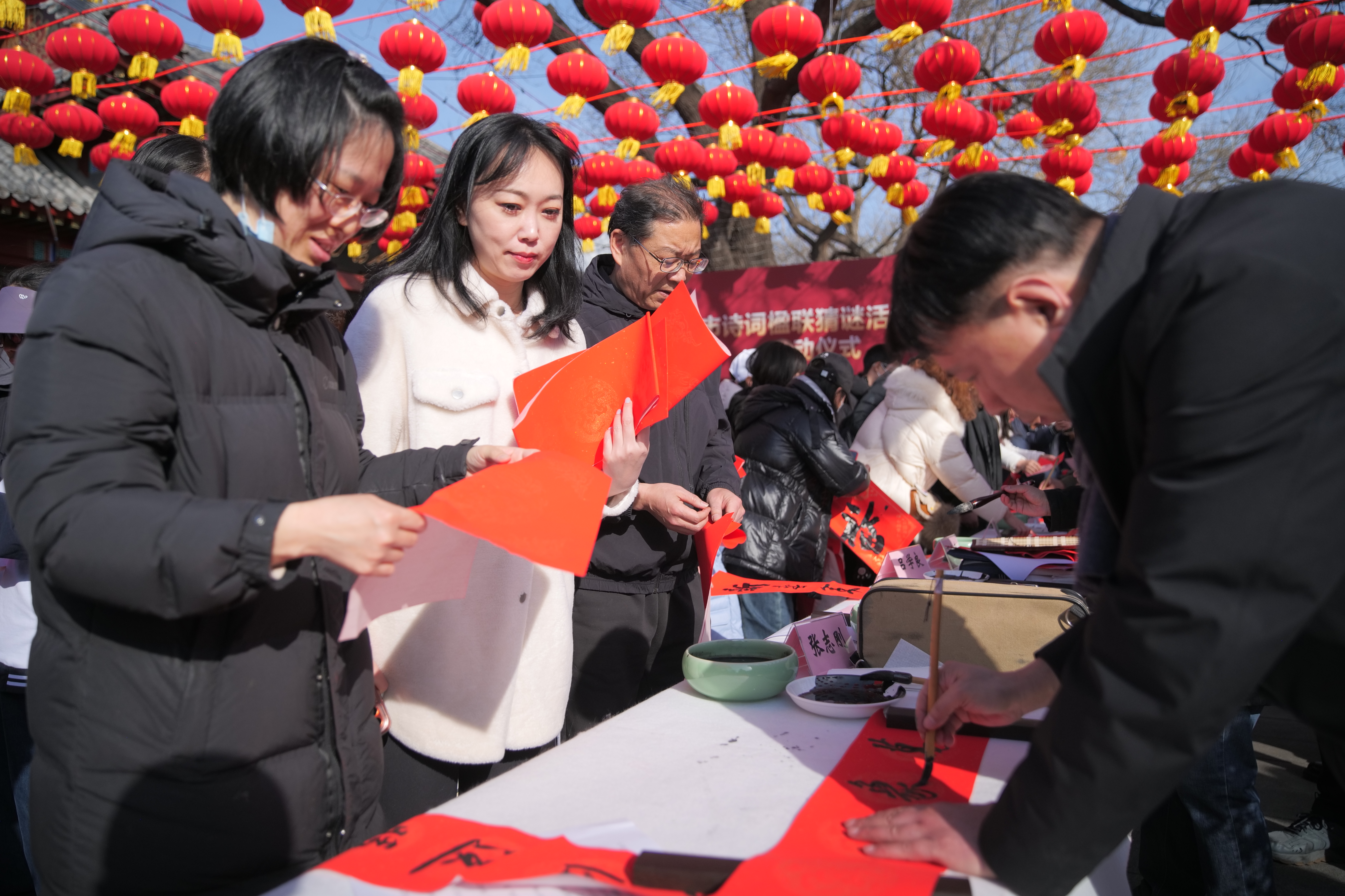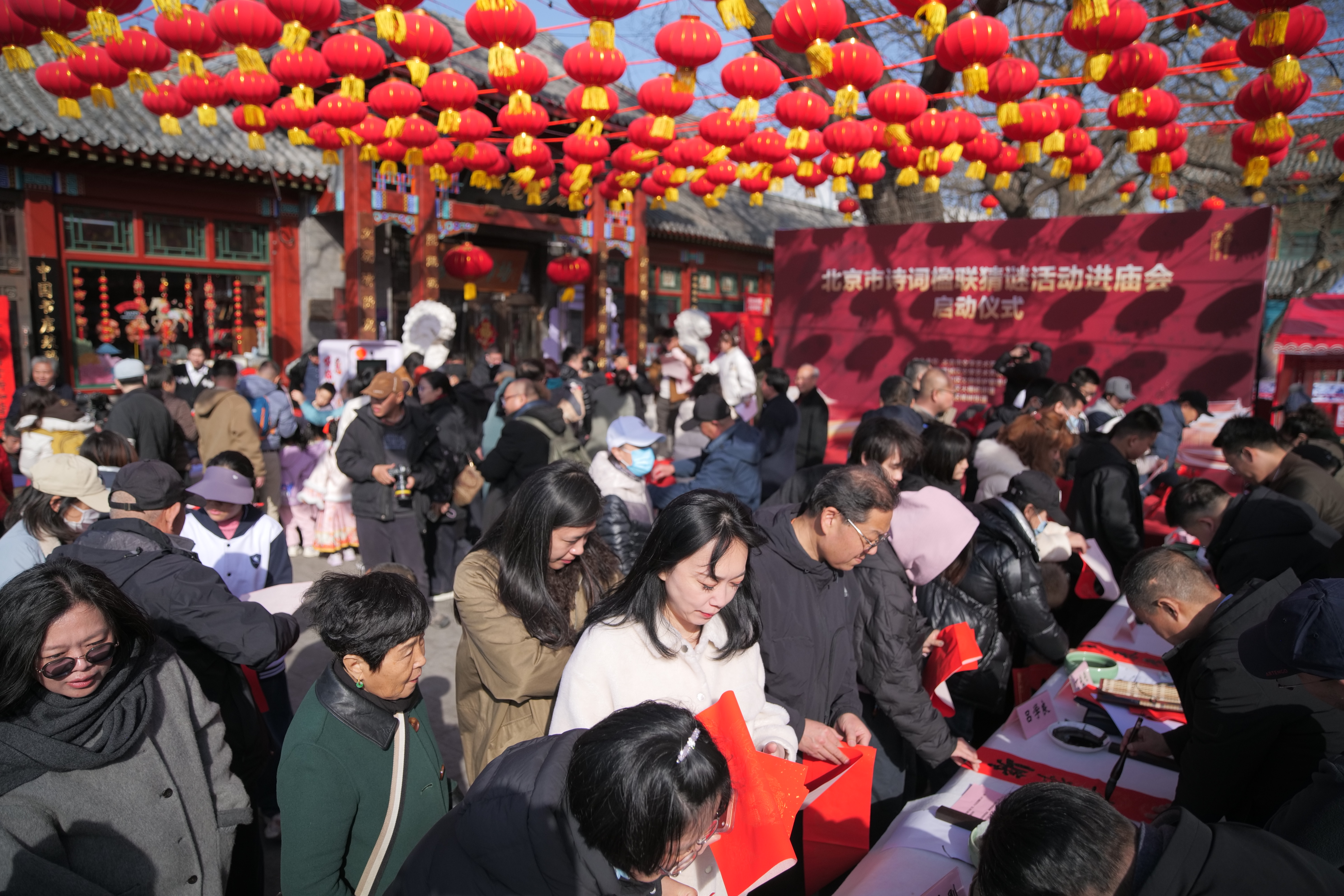 楹联寄情,诗词言志,猜谜添趣。 2月14日下午,“骏马贺新春 京彩中国年——诗词楹联猜谜进庙会”活动在西城区厂甸庙会启动。大红灯笼高高挂,楹联、诗词、猜谜融为一体,现场气氛喜气洋洋。