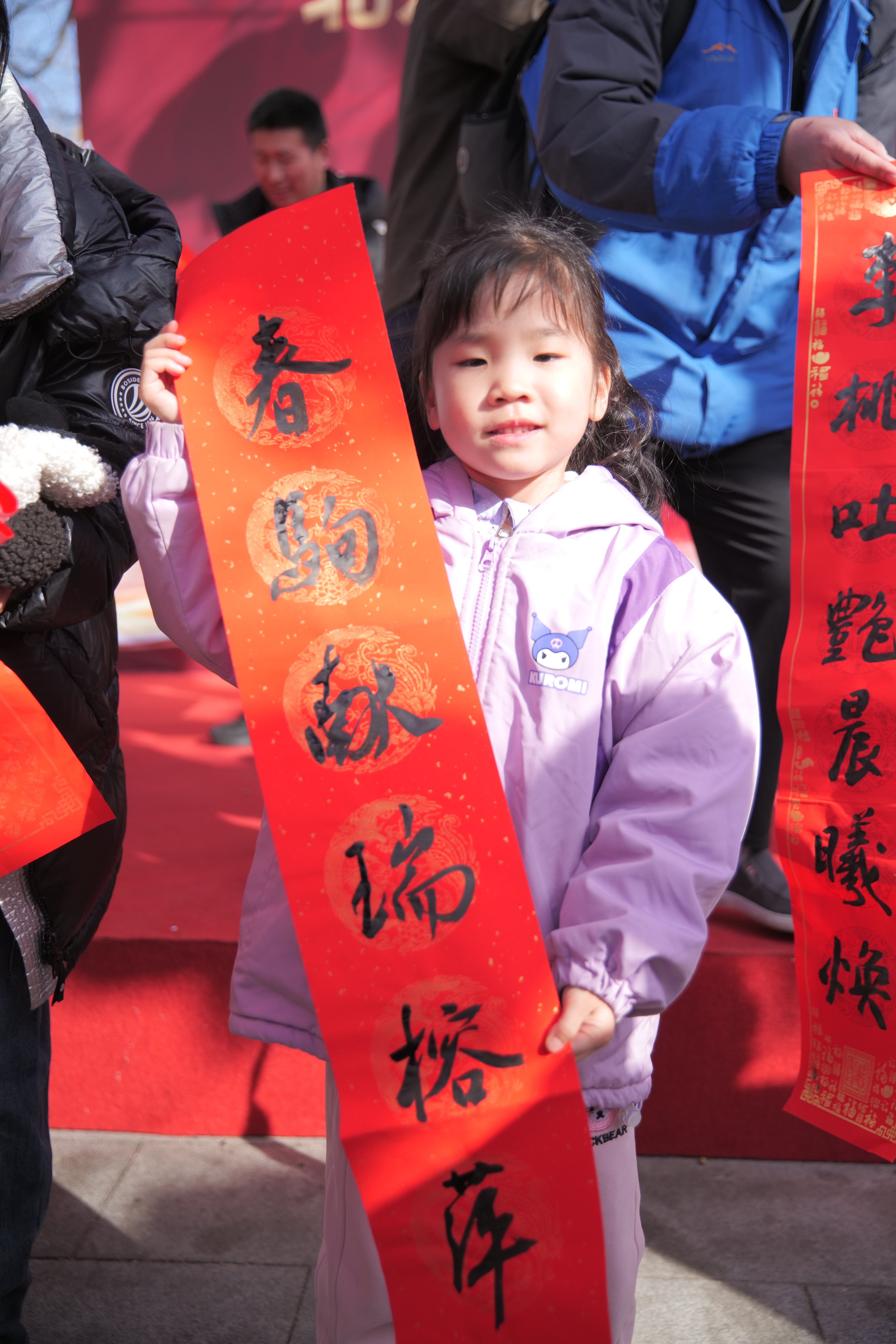 风吹动着春联和“福”字,王女士像对待珍宝一样赶紧将春联仔细卷好,放好,她此番为双胞胎女儿请来春联,一家人带着对新年的美好期待,即将回到安徽老家。此时,四周也传来了兴奋的对话,“我要把春联带回福建老家”“我把春联带回河南”。