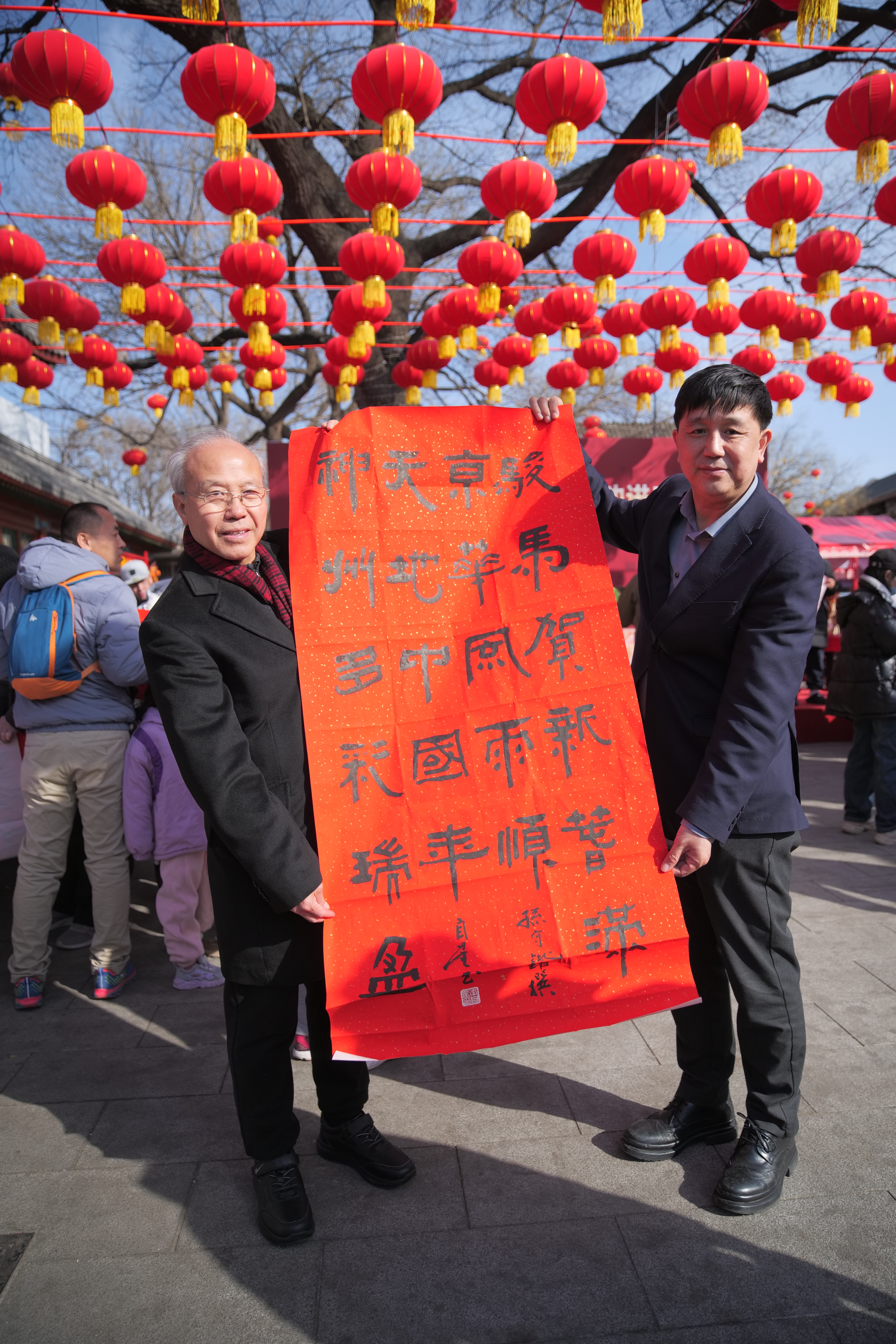 一旁的春联书写区更是暖意融融,刘俊京、程度、高风、王文英、王春山、杨东方、吕学良、丁屯屯、张志刚、关奇伟、王哲等10余位书法家参与其中,他们以笔为媒,将新春祝福与“新时代、新北京、新风尚”的时代内涵融入笔墨,楷隶行草各显神韵,一幅幅笔墨精湛、寓意吉祥的春联跃然纸上,引得群众纷纷驻足围观、排队求联。“春风浩荡展宏图,骏马奔腾开景运”,聂晓盈今年70岁了,他特意让书法家写了一副春联,“我外孙今年参加中考,希望他在新的一年积极努力,取得优异成绩。”