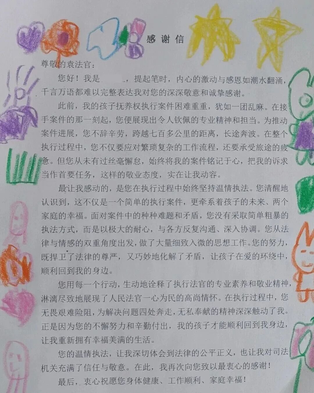 当事人给袁冰写的感谢信。“您的努力,既捍卫了法律的尊严,也让孩子在爱的环绕中回到了我的身边……”事后,孙某向通州区法院执行局送了11面锦旗,并给袁冰写了一封感谢信,字里行间皆是感激之情。