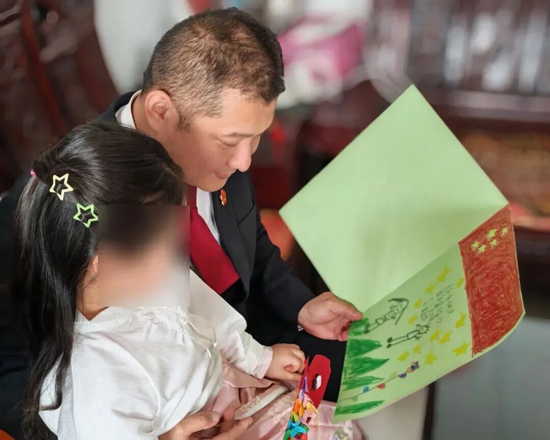 “法官叔叔,这是我画的你。”瑶瑶开心地将一幅画和一条“鱼”送到了袁冰手上。五颜六色的纸上映照出孩子的洁白无瑕,这条“鱼”是瑶瑶和妈妈一起亲手做的手工锦鲤,满满都是对法官的祝福与感激。