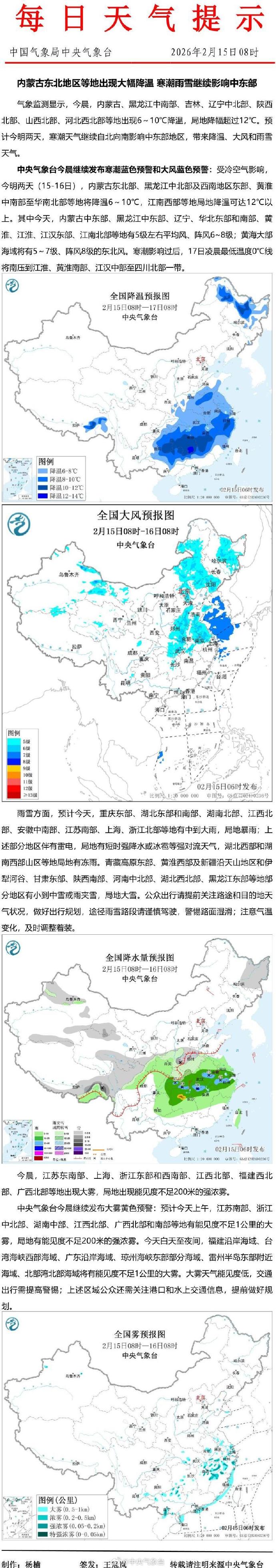内蒙古东北地区等地出现大幅降温,寒潮雨雪继续影响中东部