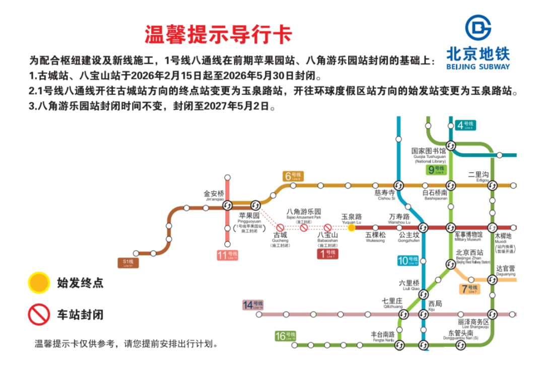 为加快推进地铁1号线支线建设,实现其与既有1号线的贯通运营,自2026年2月15日(周日)起,1号线古城站、八宝山站采取临时封站停运措施,预计持续至2026年5月底。施工期间,1号线列车运行区段临时变更为玉泉路站至环球度假区站,在玉泉路站折返运营。届时,1号线苹果园站也将同步完成改造,恢复运营,实现与6号线、S1线的三线换乘。