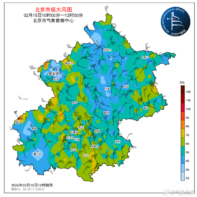 过去两小时,我市大部地区阵风6级左右;极大风速出现在门头沟区灵山,为21.7m/s (9级),平原地区出现在海淀区车道沟,为16.7m/s (7级)。