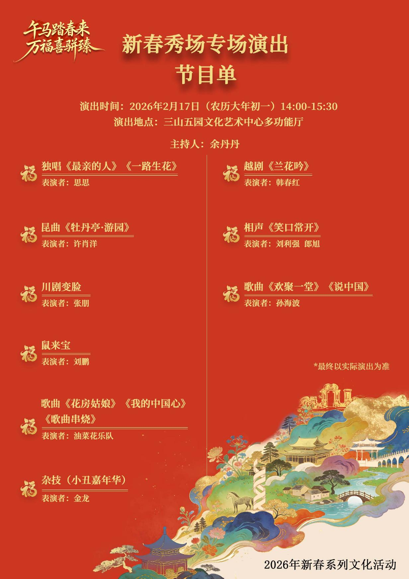玩法:①限量福袋免费领,不用集赞,凭缘分解锁马年第一份惊喜!②关注活动小红书官方账号“2026年新春系列文化活动”,获取寻“马”线索,到场馆内按规则参与线索寻找活动,即有机会获得“金马福袋”。③现场拍摄活动立牌并参与小红书话题#三山五园文化艺术中心寻金马或#“午马踏春来,万福喜骈臻”——2026年新春系列文化活动 发布图文,还有机会领取新春限定福包。④现场还有财神NPC巡游、昆曲杂技展演,好玩又好拍!