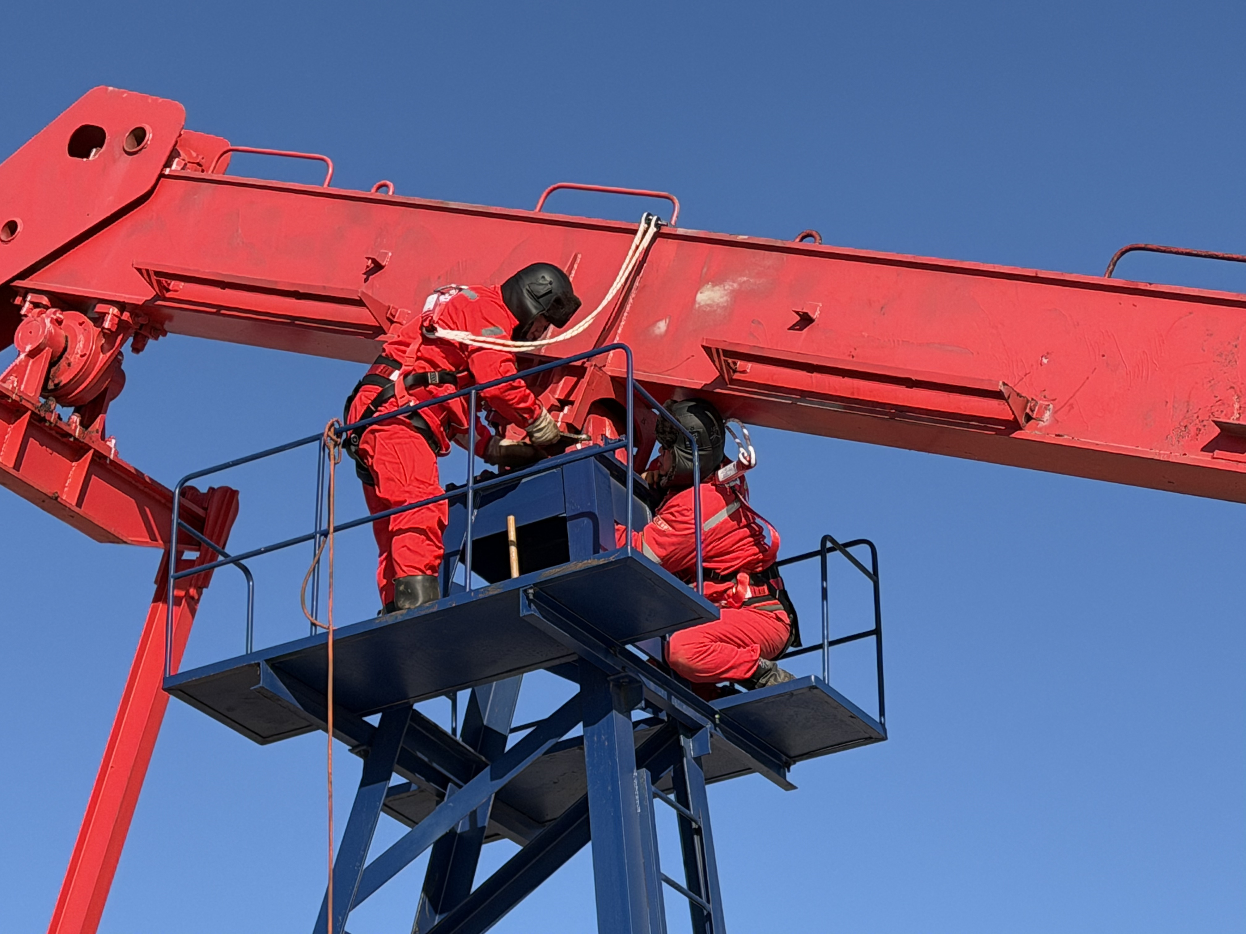 检修抽油机需三人配合完成,维修工梁阳和孙国庆先将敲击扳手、锤子等工具运送到近10米高的抽油机作业平台,再沿着梯子缓慢攀爬,每向上几步便检查扣紧安全绳卡扣。没有建筑物遮挡,寒风像刀子一样刮在脸上。