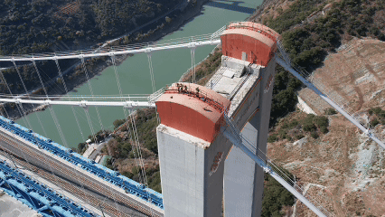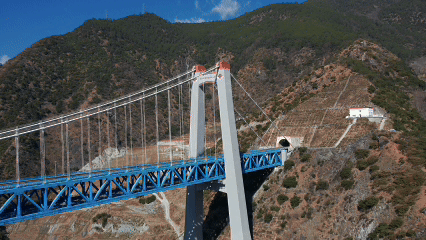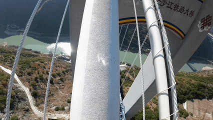 虎跳峡金沙江铁路大桥全长882.5米,主跨660米,连接玉龙雪山隧道与哈巴雪山隧道,桥面离江面垂直距离约250米,是一座名副其实的“云端天梯”。
