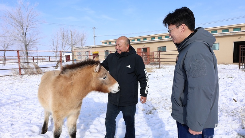 高级工程师恩特马汗·阿站汗和徒弟正在对普氏野马“清明”进行日常监测 (央广网记者 丁安 摄)