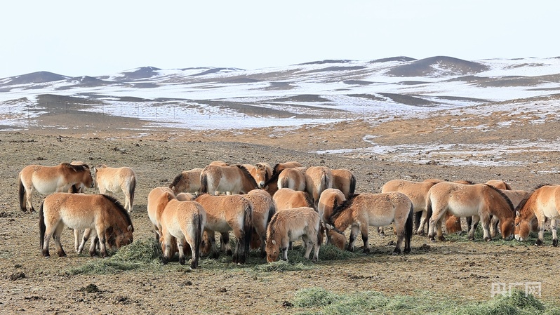 新疆卡拉麦里山有蹄类野生动物自然保护区,普氏野马们正在悠然吃草料 (央广网发 马凯雄 摄)