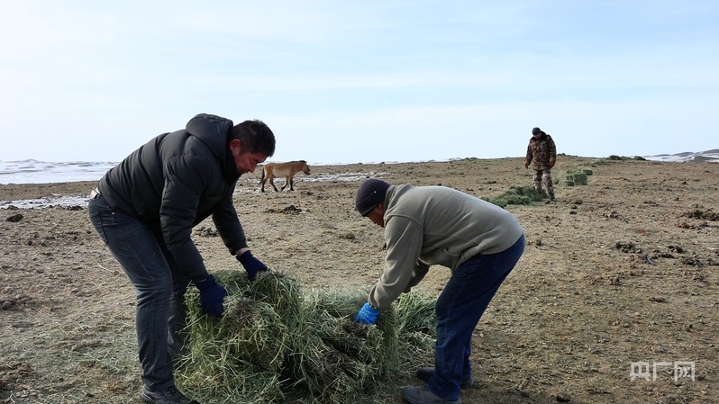 乔木希拜普氏野马监测站站长蒙坎和其他管护员正在给普氏野马投放饲料 (央广网发 龚向前 摄)