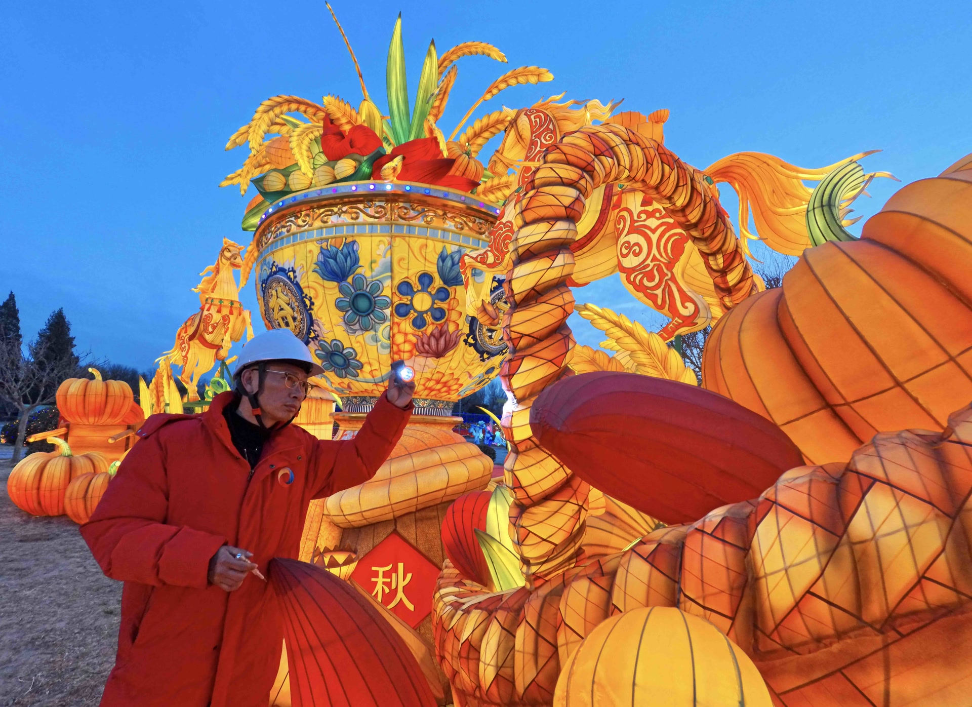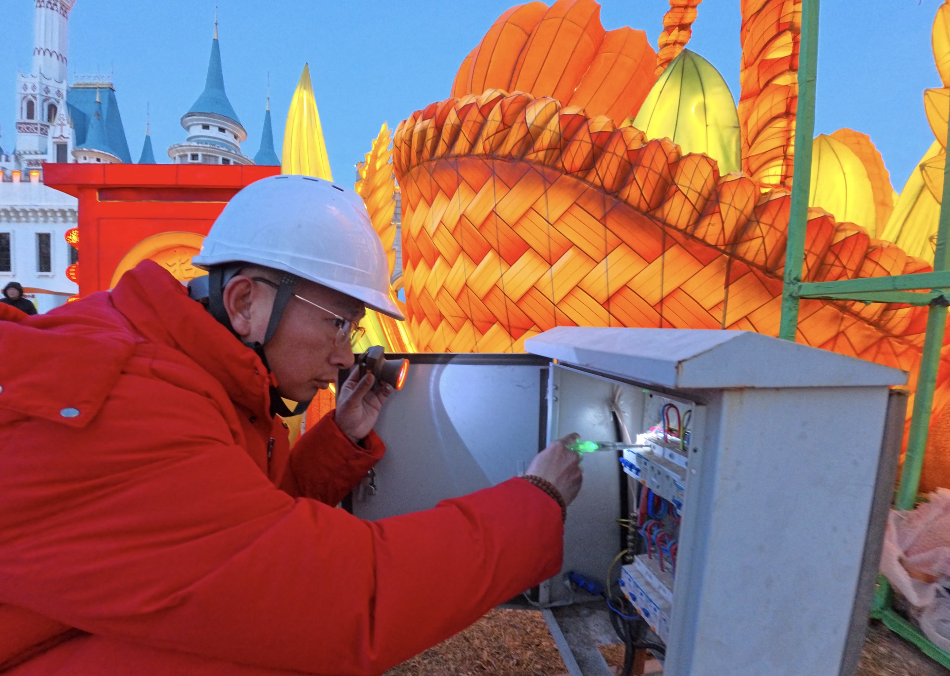 2月15日傍晚,夜幕初垂,北京世界公园内的彩灯一盏盏亮起,来自四面八方的游客来到京彩新春彩灯嘉年华,赏灯游园寻找年味儿。游客们涌向东门处“五谷丰登”大型灯组前拍照,花灯背后一处不起眼的配电箱前,手持测电笔的工程部技术人员阳超俯身检测,目光牢牢锁定在仪表盘上跳动的数字。