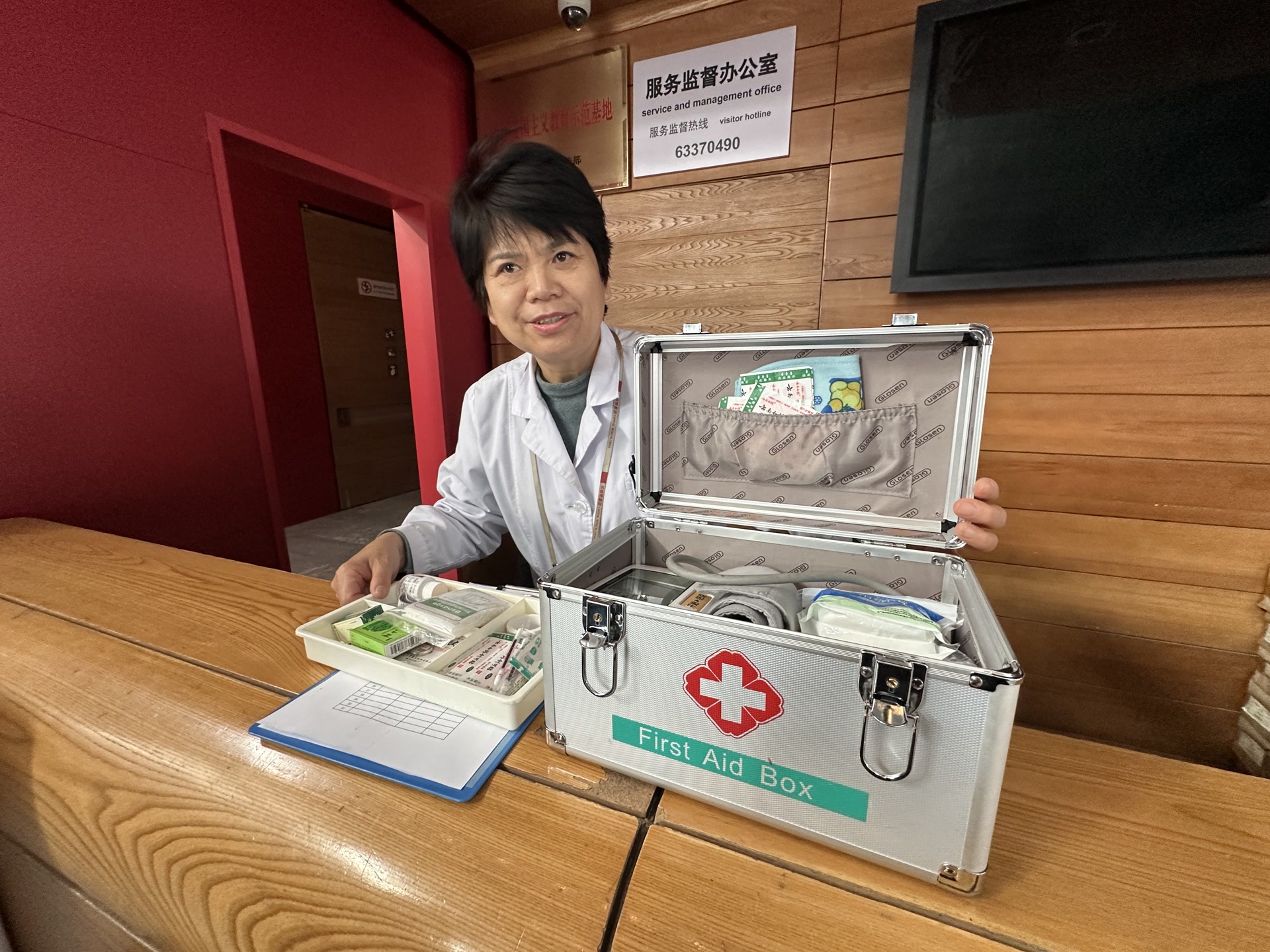 一层大厅的服务台,物业服务部还提供一项特殊服务——馆医,专门为遇到突发情况的游客提供及时的医疗救助。“我们这里有碘伏、速效救心丸、云南白药、血压计、绷带等常用的药品和医疗物资。”当天值班的馆医辛向红向记者展示配备的“医疗箱”,“游客不小心割伤、扭伤或者低血糖等情况,都能在这里得到及时处理。”