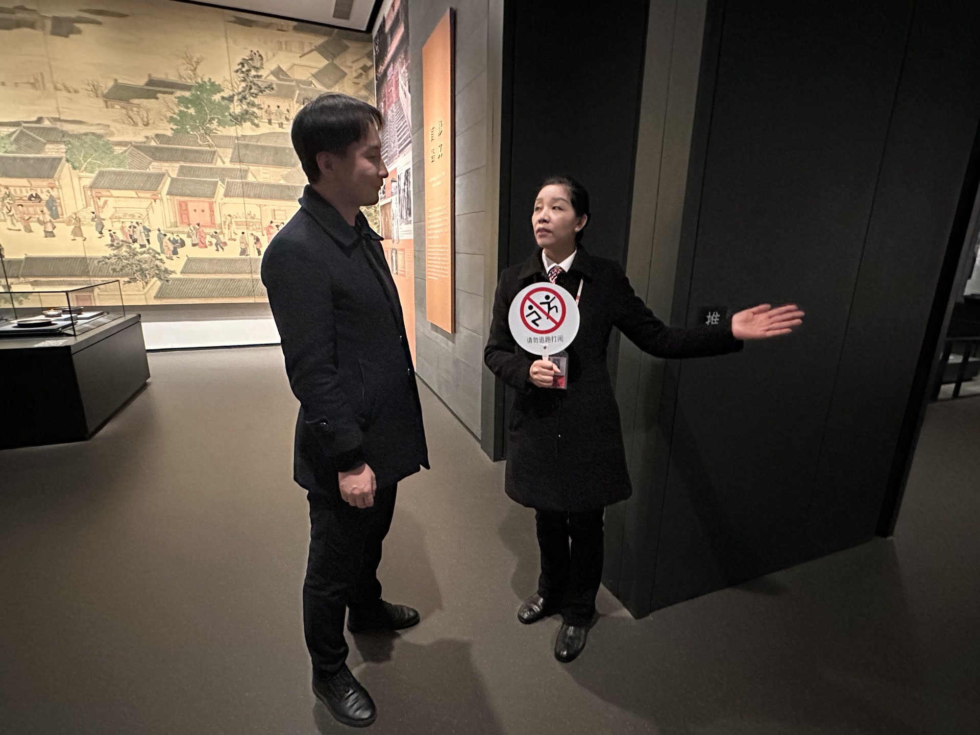 方厅三层,展服部员工杨琳琳也早早到岗,整理自己负责区域的卫生。9时许,游客陆续进入展厅,杨琳琳手持文明提示牌,开始来回巡视。“小朋友慢一点,这里灯光偏暗,小心磕碰!”“您好,请勿触碰展柜,文明观展,谢谢您的配合!”……杨琳琳随时关注着周围情况,及时对不文明行为进行提醒。“您好,请问镇馆之宝‘伯矩鬲’在哪儿?”“在方厅二层,出门下电梯再左拐就到。”面对这样的游客询问,杨琳琳总能脱口而出。在首博工作5年,她对展厅布局、展品位置、最新展览都相当了解。春节假期,首博延时开放至晚上7点,除去短暂休息,杨琳琳每天要站立、行走近10个小时,“假期客流大,我们更要坚守岗位,维持好秩序,服务好每一位游客。”杨琳琳笑着说。