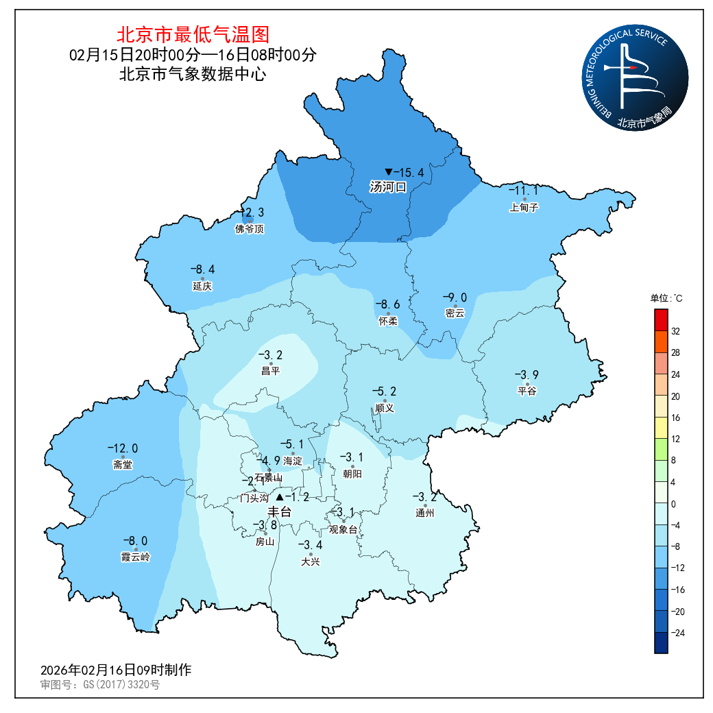 2月15日20时至16日08时,观象台最低气温-3.1℃(07:15)。